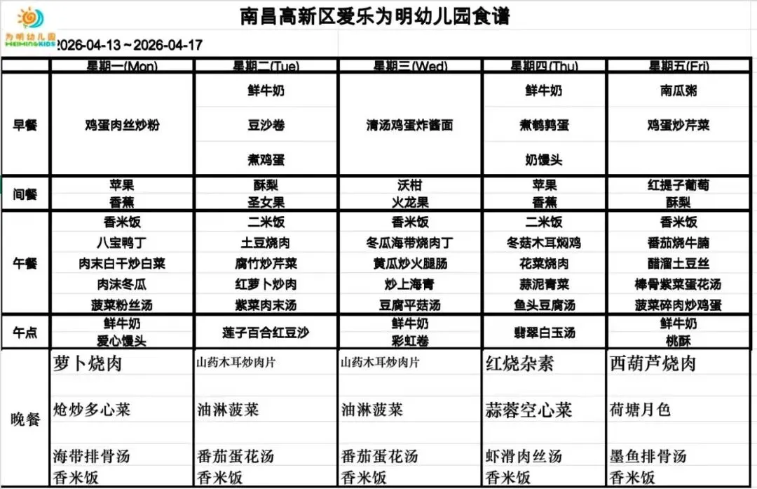 >南昌高新区爱乐为明幼儿园周营养食谱(2026.4.13-2026.4.17)