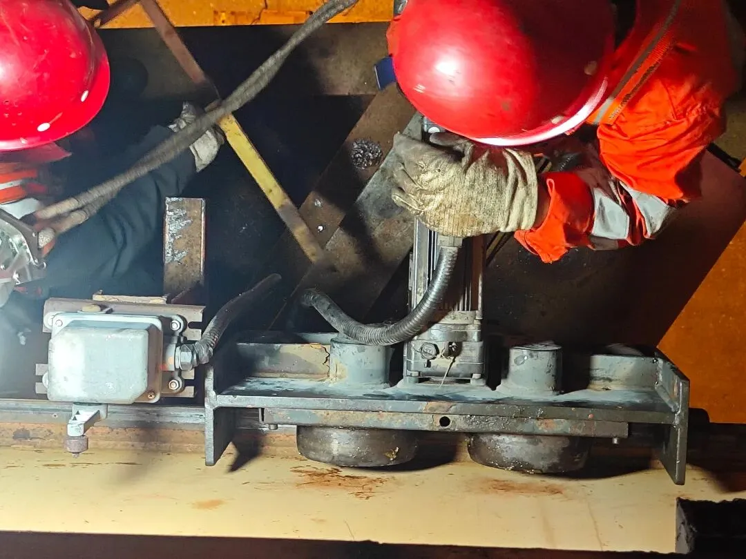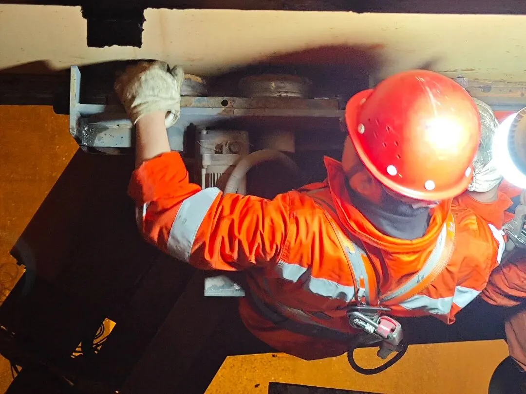 但新方案带来了更棘手的新难题:必须用大吨位千斤顶将小车整体顶起,同时将走行传动机构精确调整至水平状态,才能把损坏的轴承顶出来。空间狭小、光线昏暗,千斤顶每顶升一厘米都伴随着金属的嘶鸣声。此时已经是深夜,近300公里夜间车程的劳累、通宵作业的困意、故障处置的压力一股脑向所有人袭来,可抢修没有退路。小组成员咬着牙迎难而上,分工协作、轮流上阵,有人趴在地上观察水平,有人紧握撬棍微调角度,汗水混着铁锈味浸透工装。