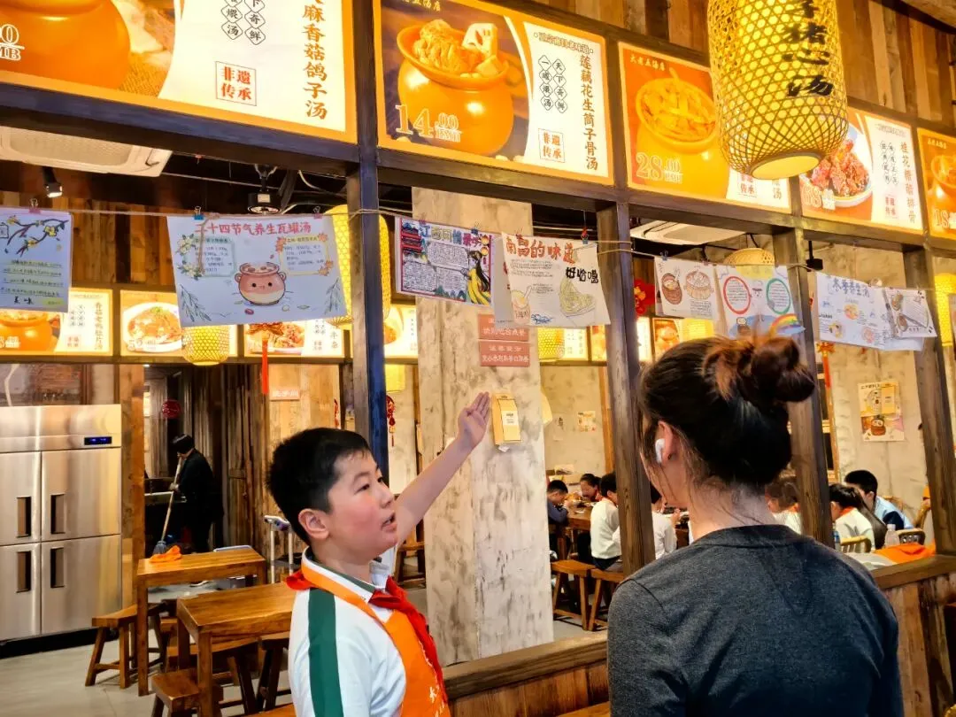 走进豫章大老五煨汤店内,一幅幅由队员们亲手创作的瓦罐汤主题绘画作品整齐悬挂,以稚嫩却生动的笔触,勾勒出南昌瓦罐汤的千年韵味。队员们落落大方地为外地游客讲解瓦罐汤的历史由来、传统工艺,分享藏在美食里的家乡文化与文明美德,让外地游客在飘香的瓦罐汤中,读懂英雄城的温暖与底蕴。