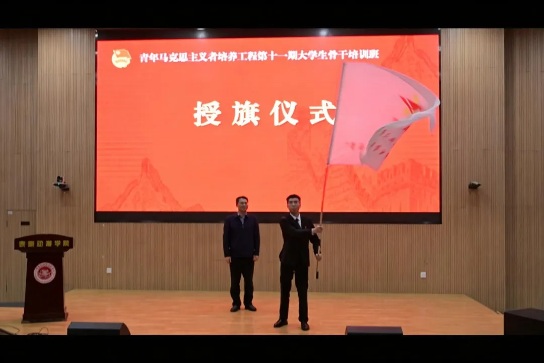典礼迎来最庄重的授旗仪式,党委副书记旷强军手持青马旗帜,郑重授予第十一期大骨班学员代表舒磊。旗帜的传递,是责任的交接,是精神的传承,更是学校对青年骨干的殷切期望。舒磊同学庄重接过旗帜,目光坚定,象征着全体学员将扛起青马使命、传承青马精神,在青春赛道上奋勇争先,现场再次响起热烈掌声,共同见证这一意义非凡的时刻。