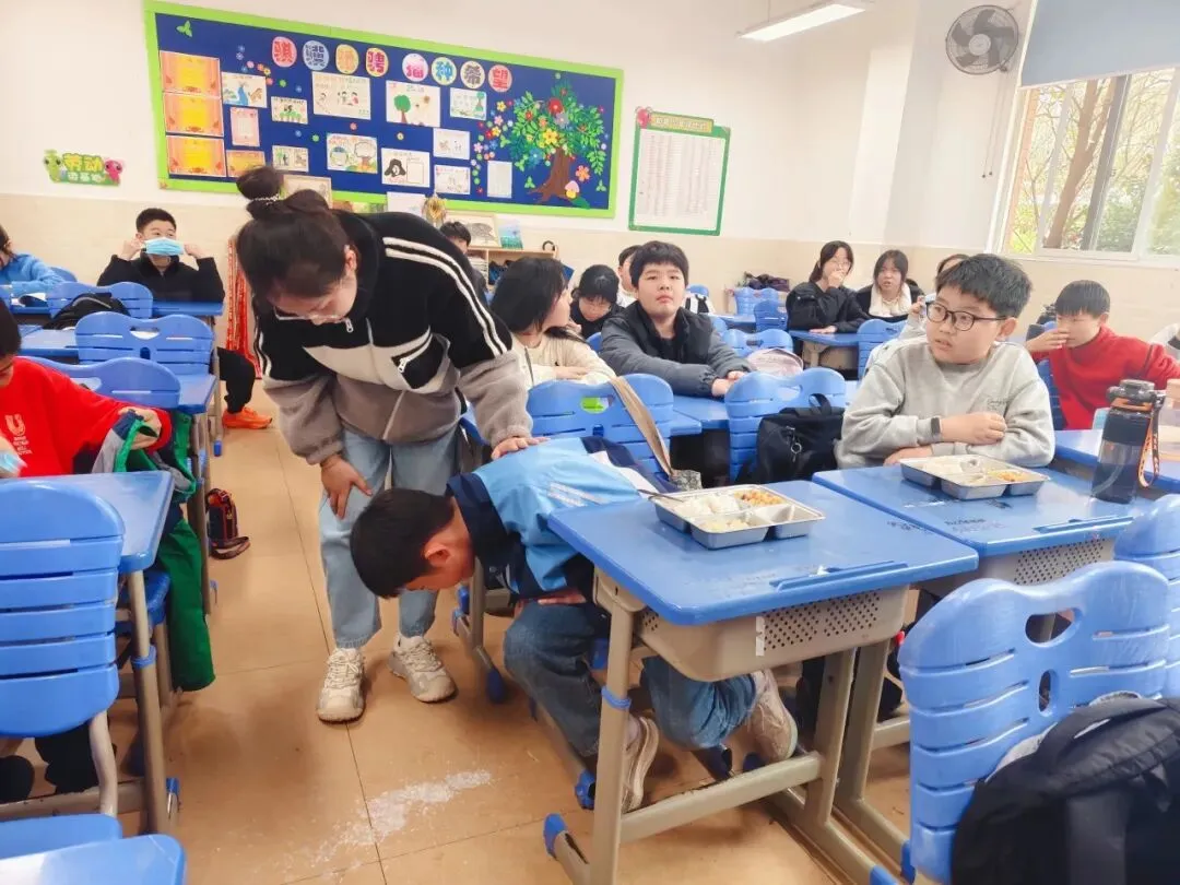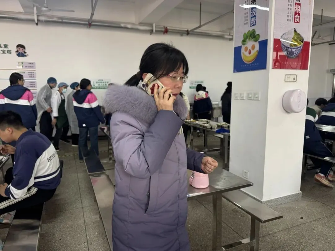 班主任发现学生异常后,第一时间停止涉事学生进食,一边温柔安抚学生情绪、仔细查看身体状况,一边通过校园应急电话,向学校食品安全应急领导小组详细上报学生人数、症状及就餐情况,确保信息传递准确无误、高效及时。