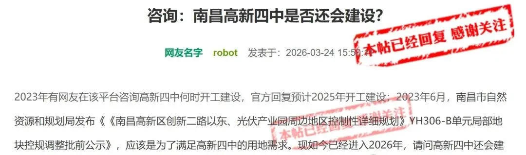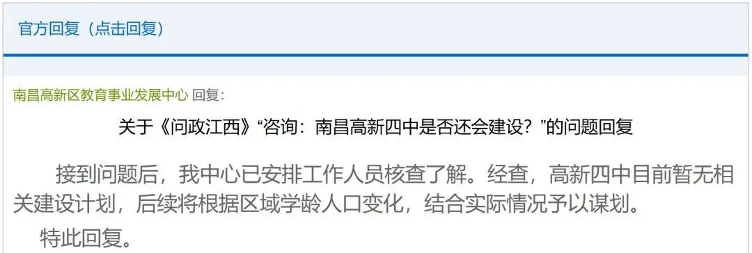 南昌高新区教育事业发展中心回复:经查,高新四中目前暂无相关建设计划,后续将根据区域学龄人口变化,结合实际情况予以谋划。
