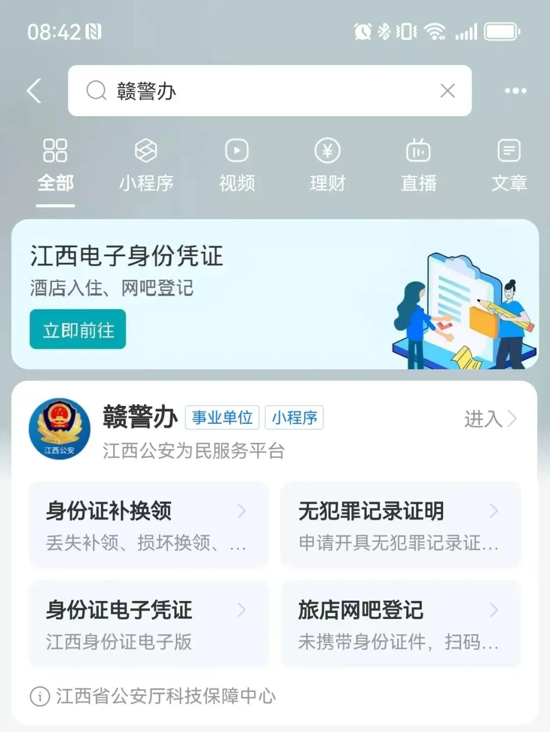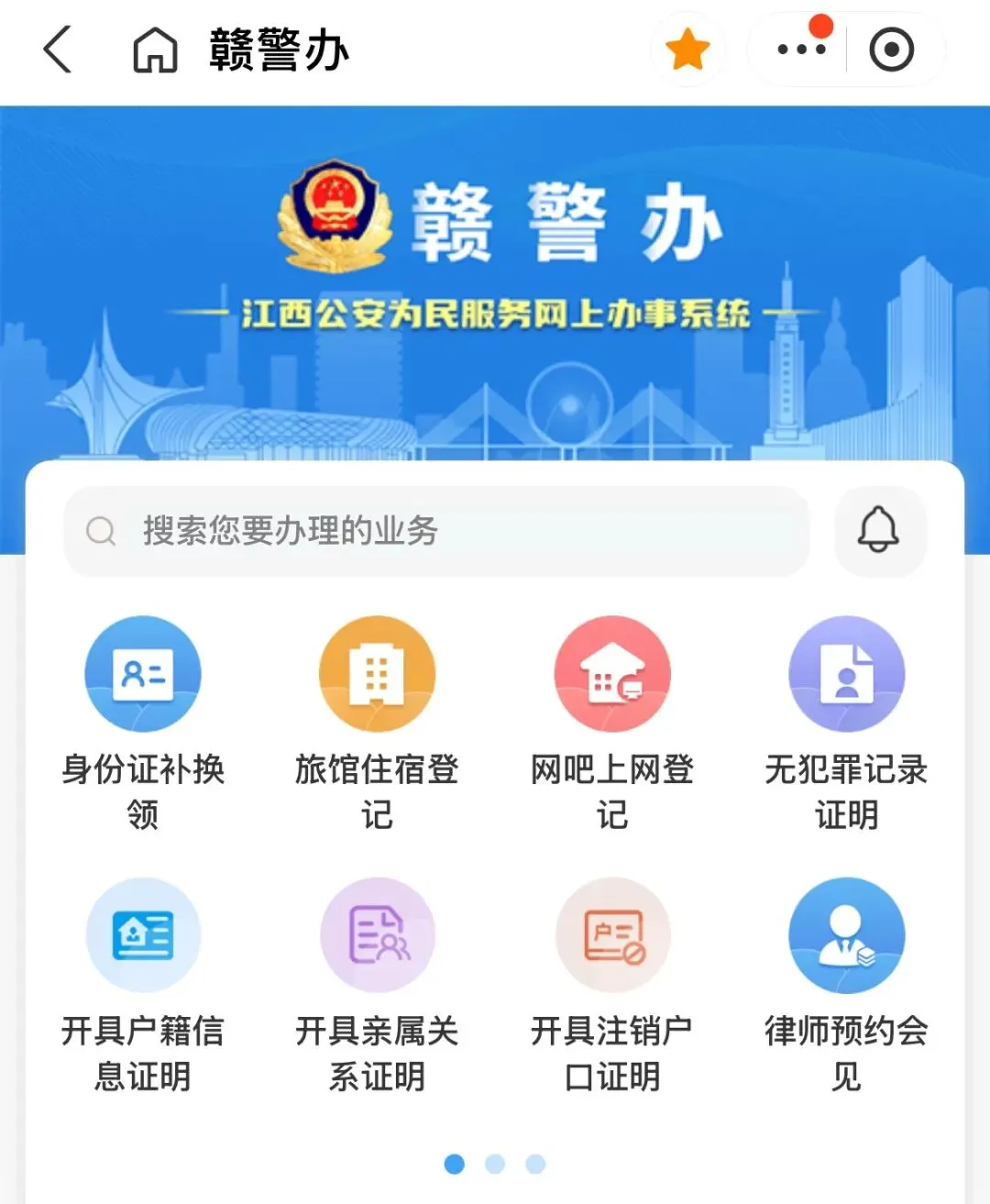 步骤1:支付宝搜索“赣服通”公安专区(赣警办)或应用市场下载“赣服通”APP进入平台。