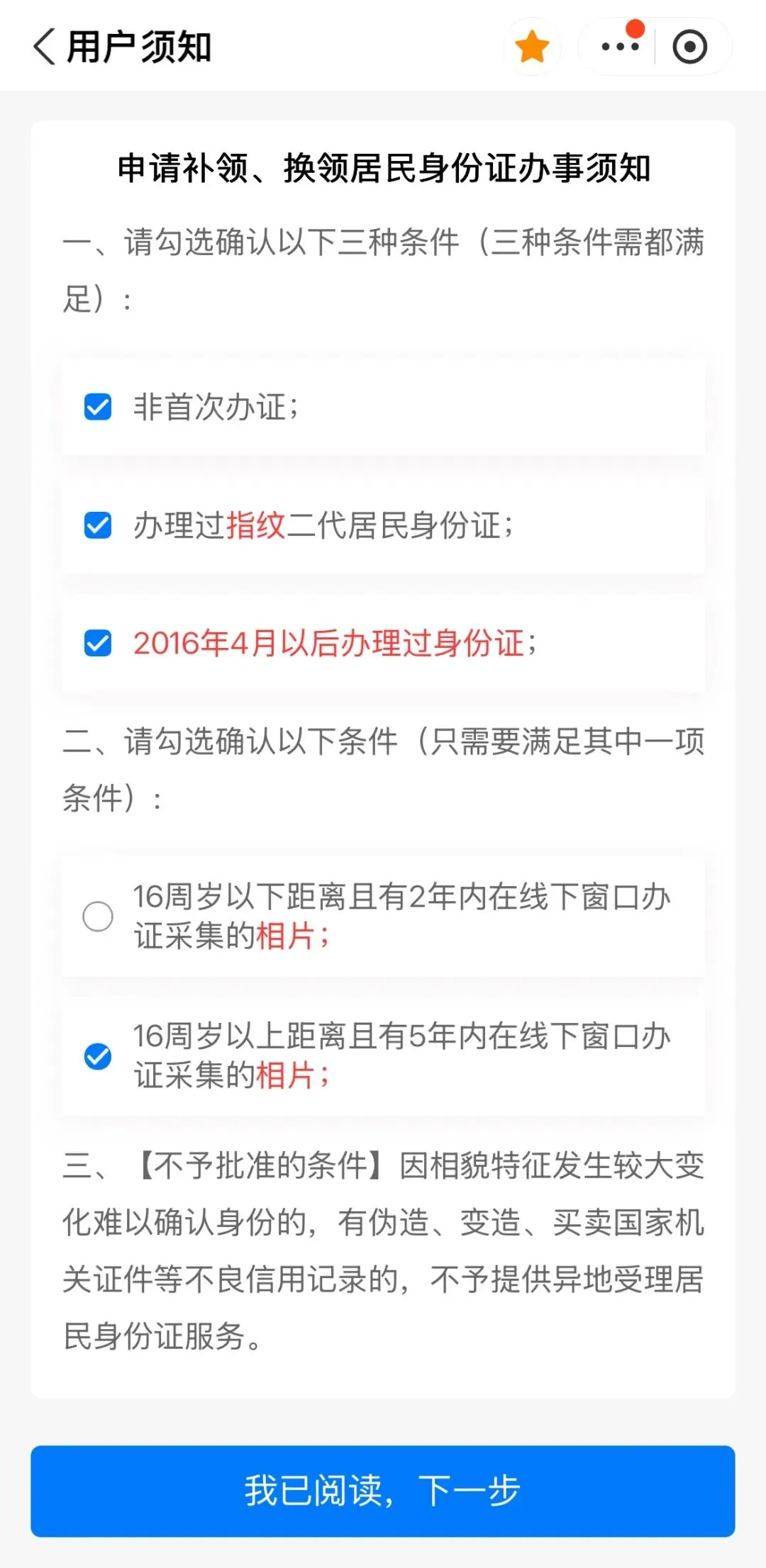 步骤4:阅读“用户须知”,并勾选相关条件,点击“我已阅读,下一步”后,进入信息填报页面,按照页面提示,完成信息填写并提交申请。