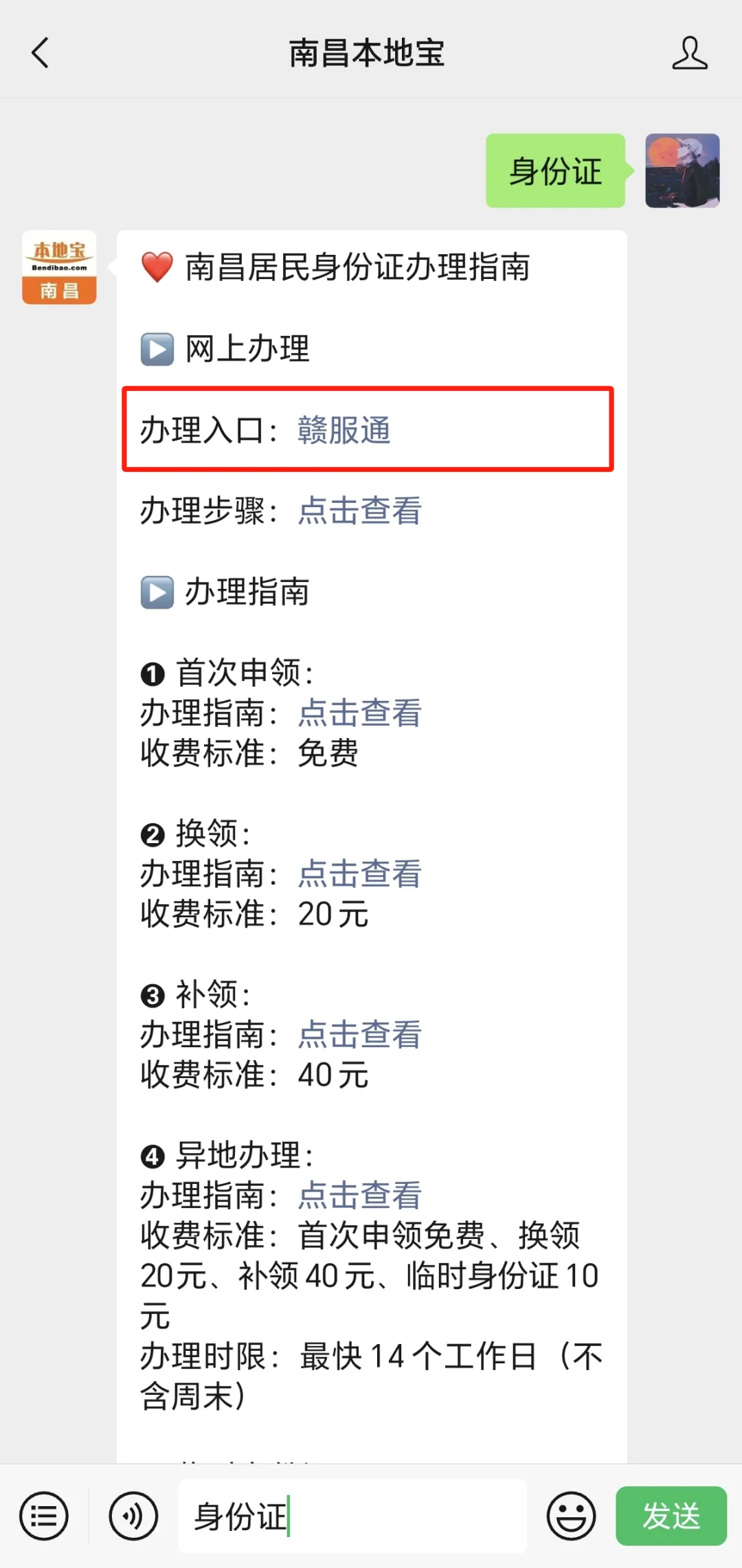 南昌本地宝推出非常多的功能,进入【南昌本地宝】公众号聊天对话框里,点击发消息,在对话框内输入并发送对应的【关键词】即可获取相关内容。