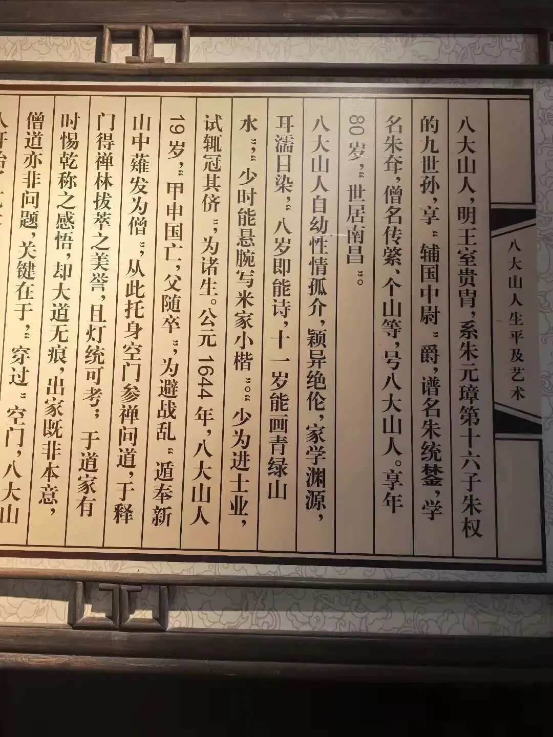 也许你和我一样曾经疑问,八大山人是八个人么?因为清代的扬州八怪不就是八个人嘛,但是他确实只是一个人,而且是王室贵胄,明太祖朱元璋第十六子宁王朱权的九世孙,出生在南昌,可惜二十岁左右时甲申国亡,父随卒,后循入空门(据说前后十年),参禅悟道,修习书画,后又转入道教,青云谱居住20多年,在此完成艺术成熟期大量书画,奠定“八大山人”风格。