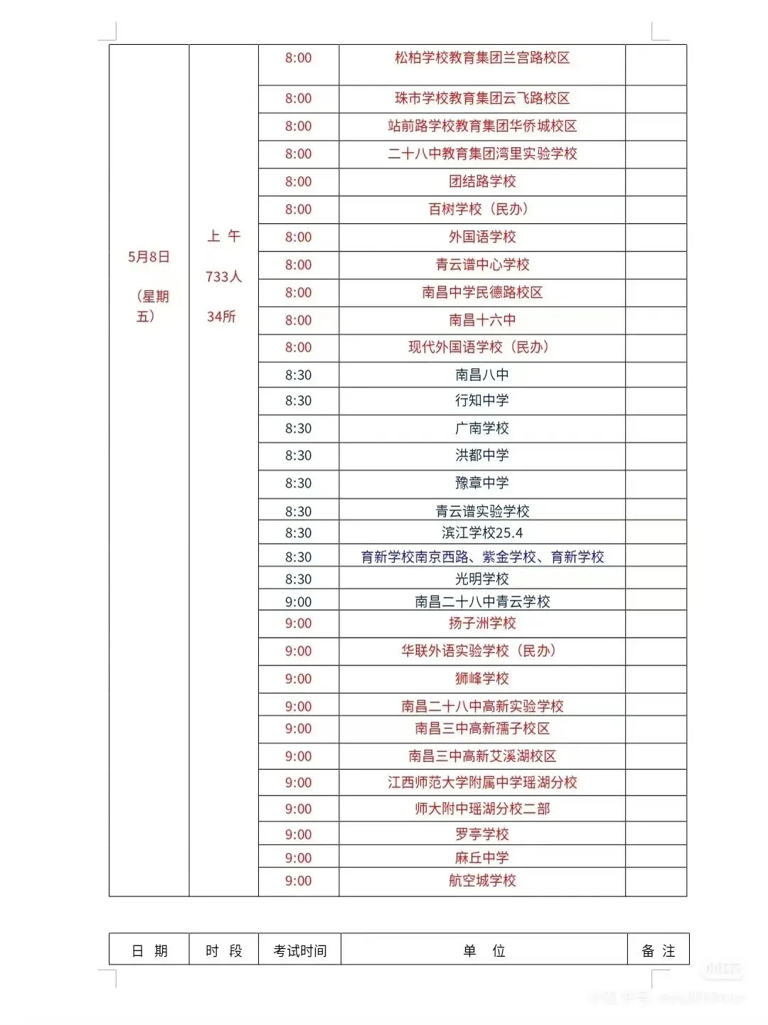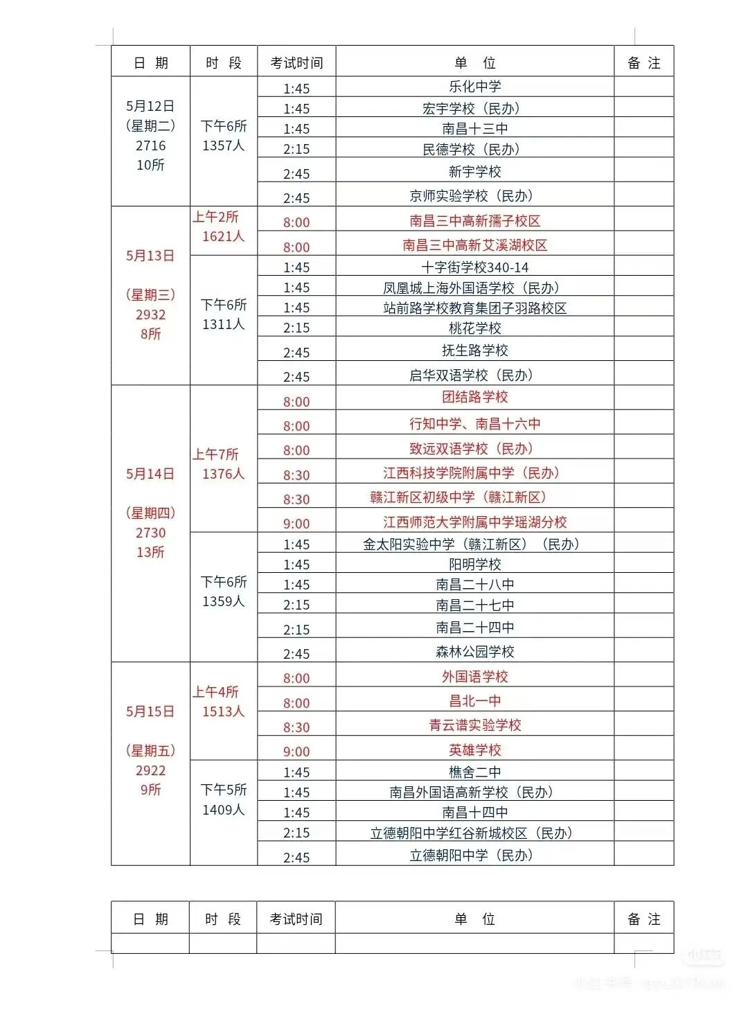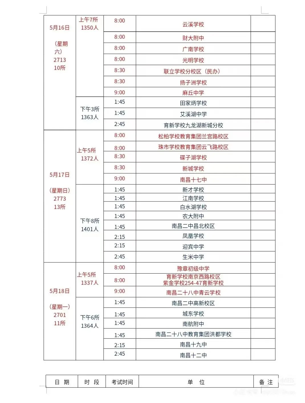 第一批次为已报考新增项目(游泳、乒乓球和羽毛球)。考试时间为5月7和8号两天;第二批次为已报考传统项目,考试时间为5月9号至21日。