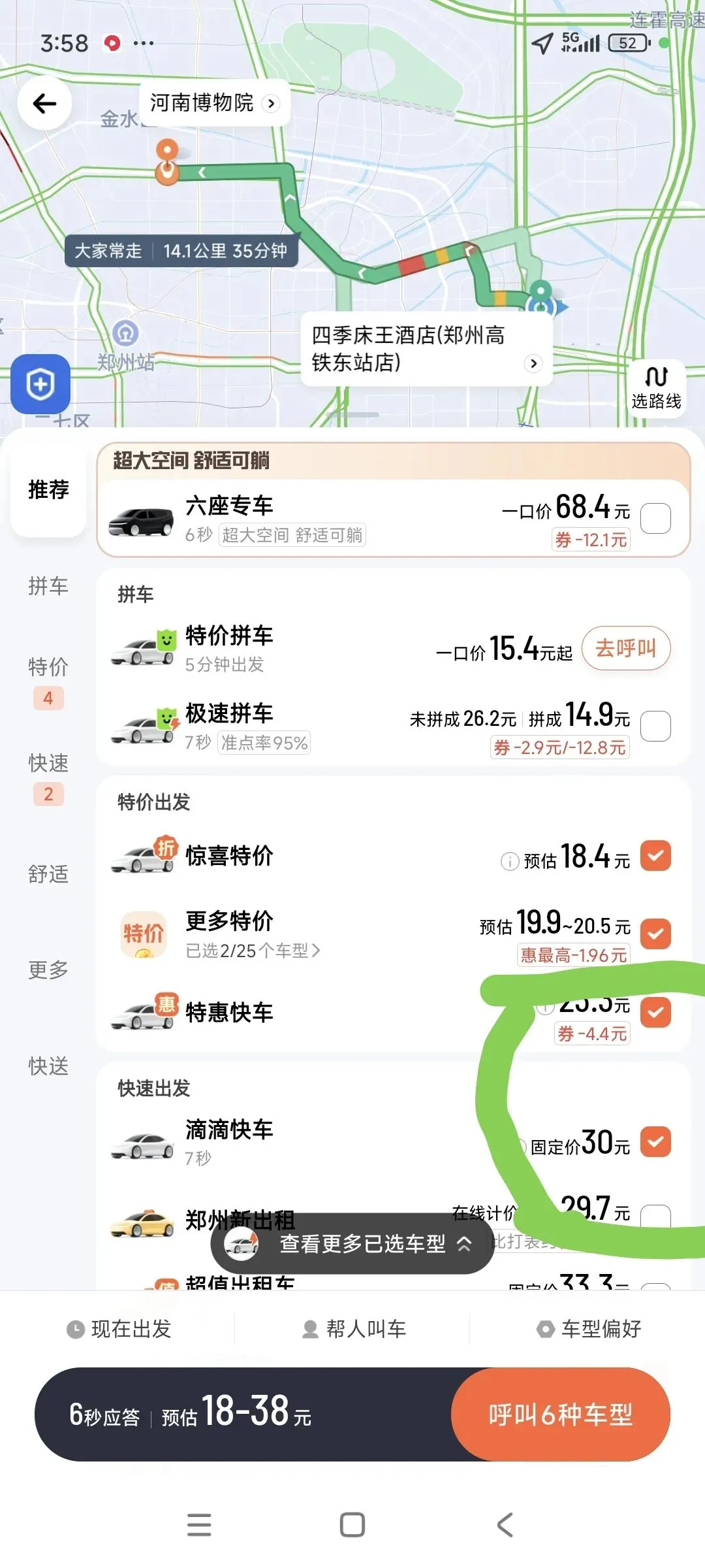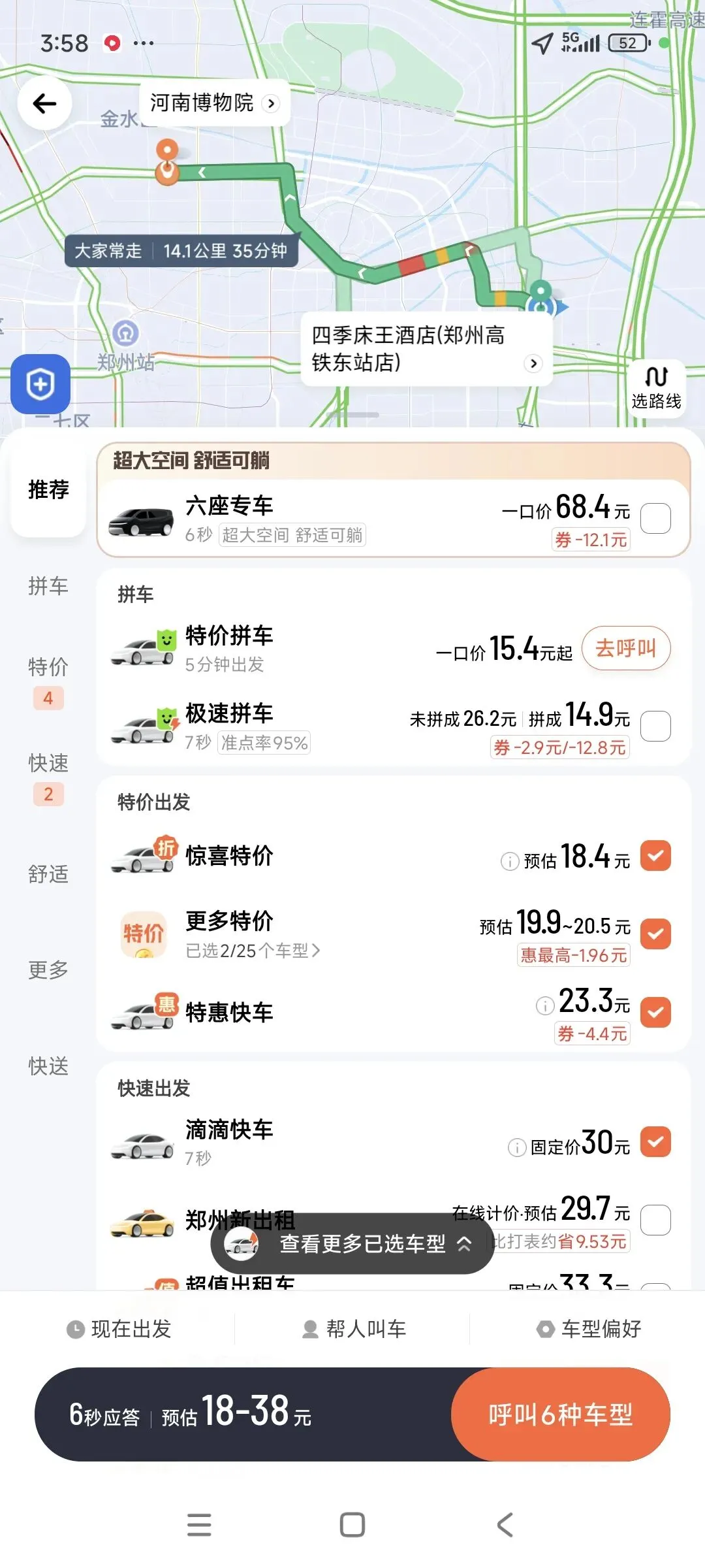 如果你不在乎,那就点击红底白字:呼叫六种车型。