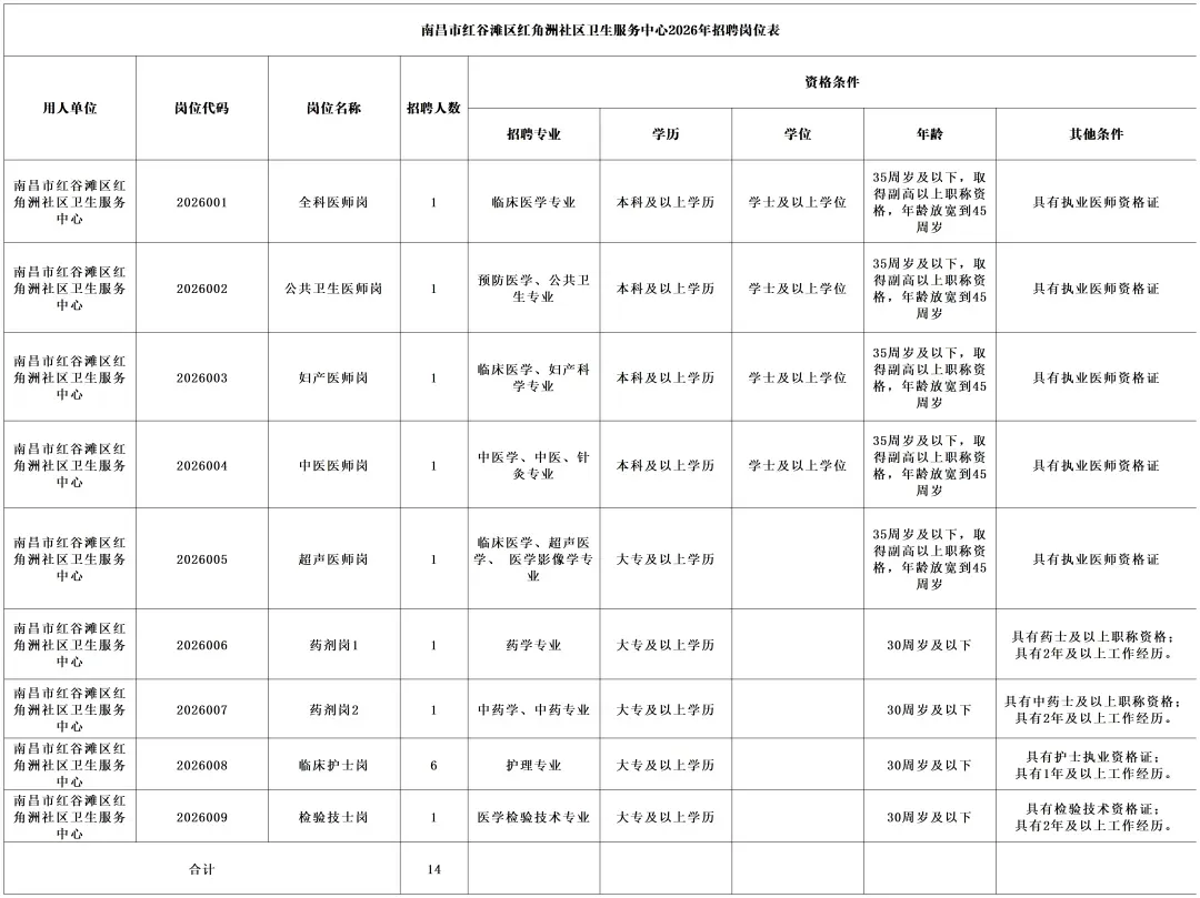 南昌市第一医院(南昌大学第三附属医院)医联体单位——南昌市红谷滩区红角洲社区卫生服务中心即将投入运行,根据工作需要,计划招聘部分专业技术人员,现将招聘事宜公告如下: