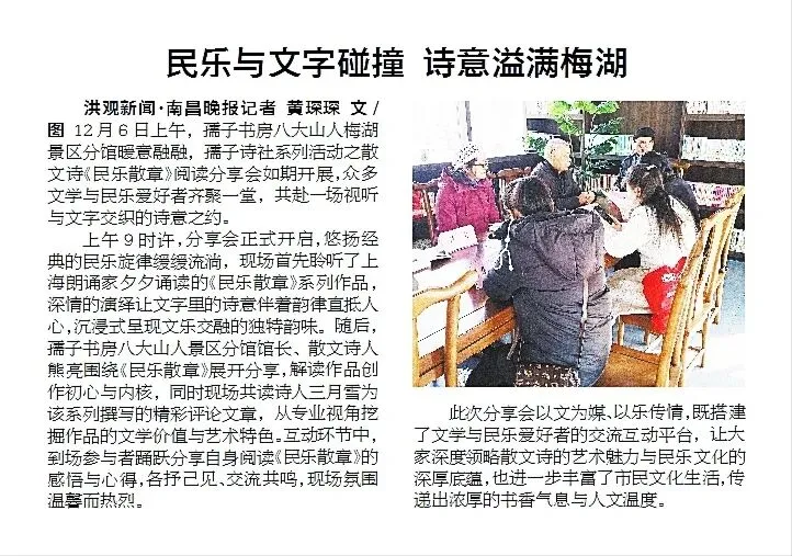 对接长三角文学圈,与上海知名朗诵家深度合作,《民乐散章》《荒原》等作品制成音画视频全网推送;奔赴湖南楚文化圣地,以汨罗江、楚辞为灵感创作《寻楚》系列,打通赣湘文脉对话通道。一路行走、一路创作、一路分享,让江西散文诗跨越山海,走进万千读者心中。