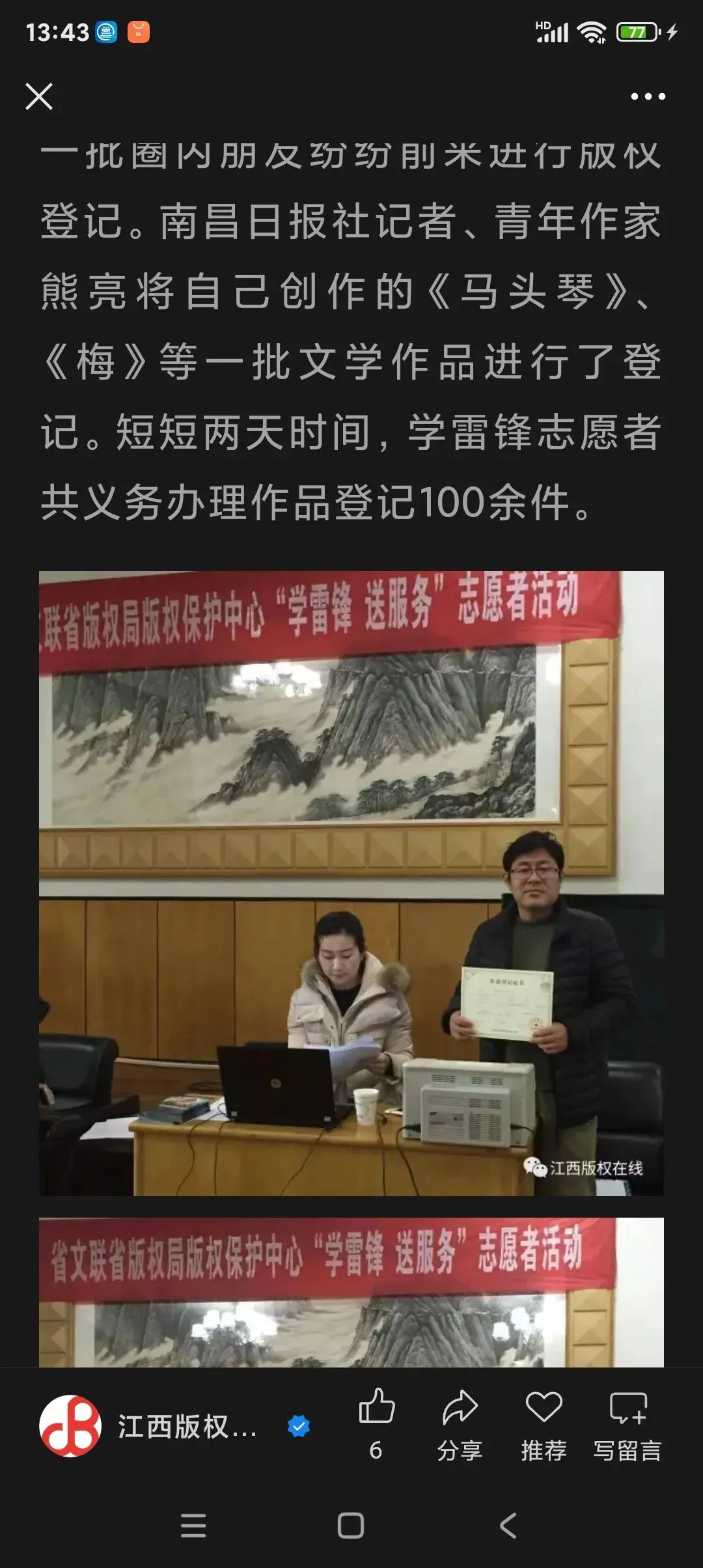 打通线上线下、主流与新媒体渠道:作品《一曲豪情南昌县》登陆央广网,被人民网、光明网等中央媒体转载;散文诗音频在江西新闻广播、喜马拉雅等平台热播,全网收听量破百万;入驻潮新闻、顶端新闻等全国新媒体平台,以文字随笔、游学影像等形式出圈引流,让散文诗从小众文学走向大众视野、走进年轻群体。