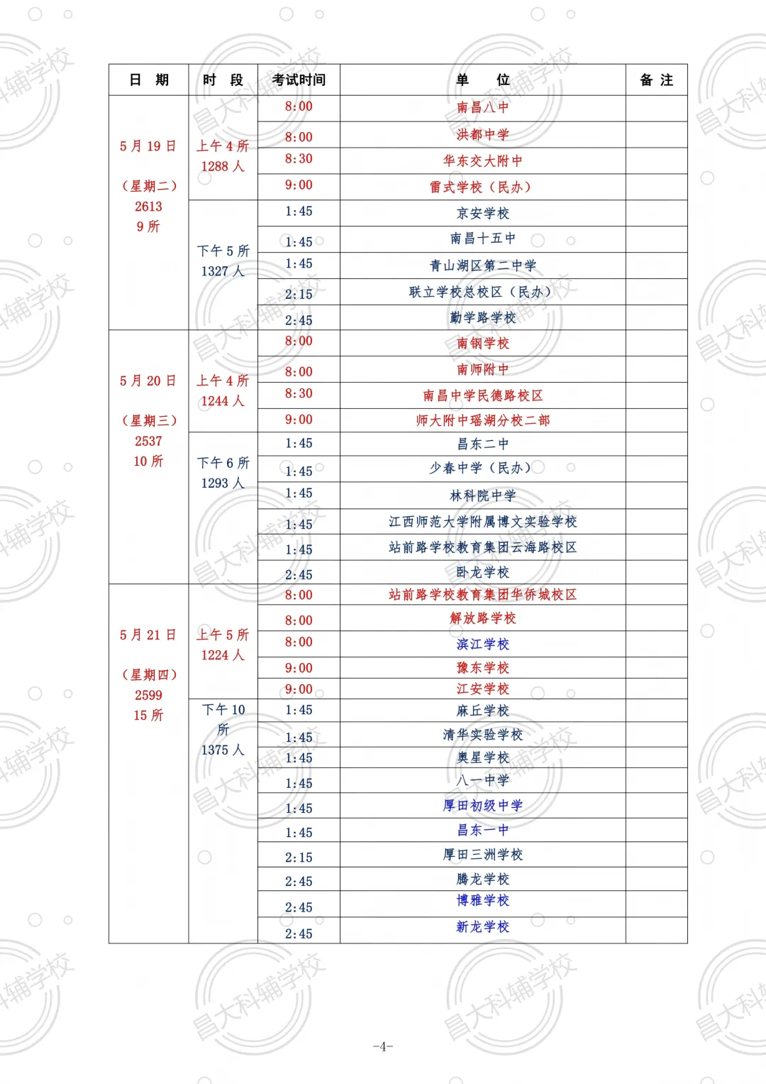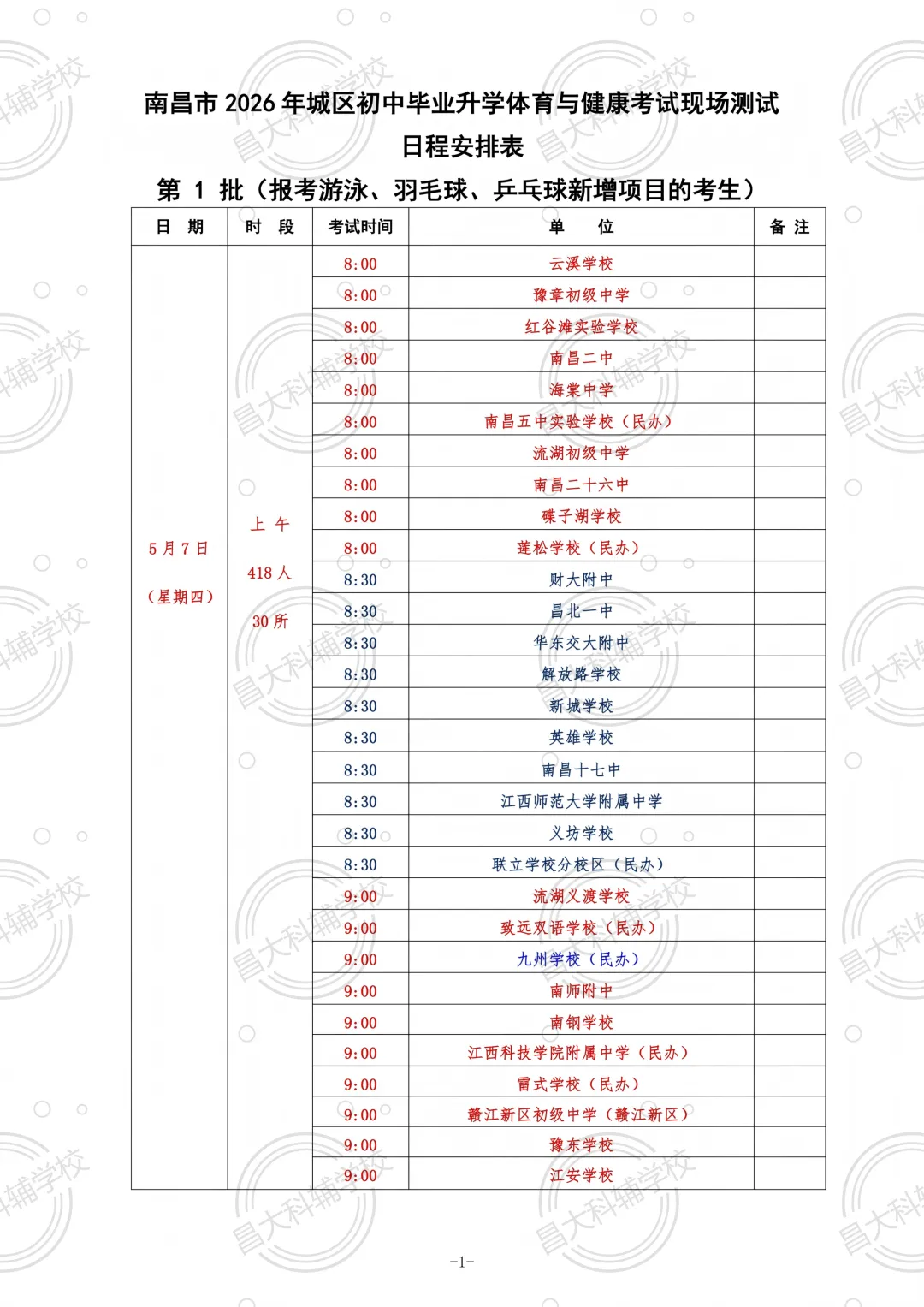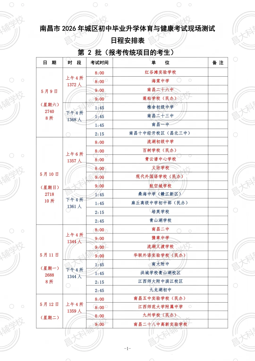 2026南昌中考体育各校考试日程安排如下:
