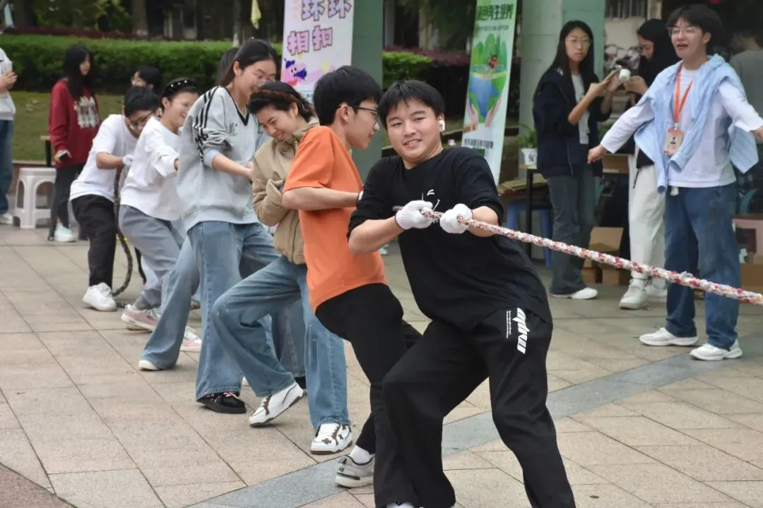 技能闯关期间,“力拔山河”拔河赛同步火热进行,各班代表队由四名男生、四名女生组成。参赛队员紧握长绳、奋力拉扯,啦啦队呐喊助威,赛场氛围紧张激烈,充分展现了公管学子的拼搏精神与班级凝聚力。