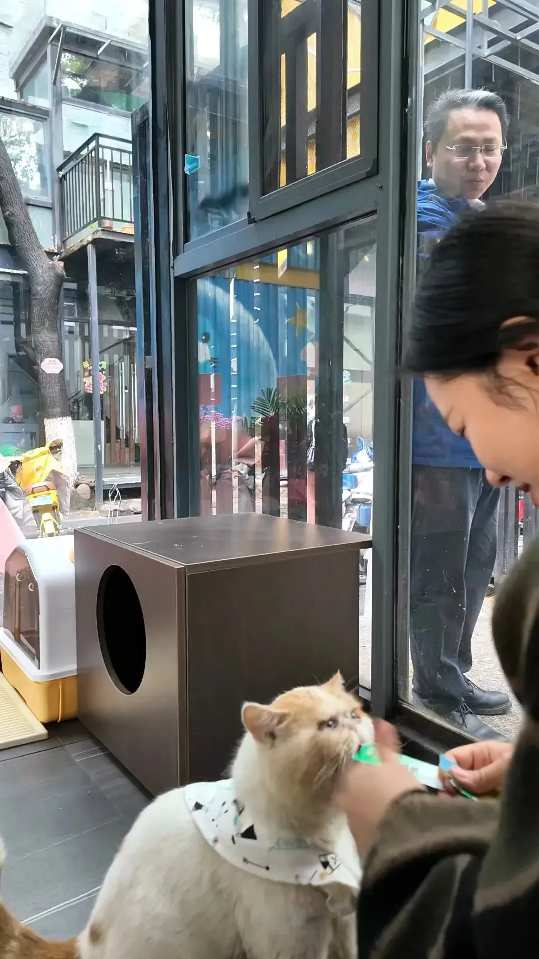 有顾客带着猫条投喂,猫咪们则大快朵颐。