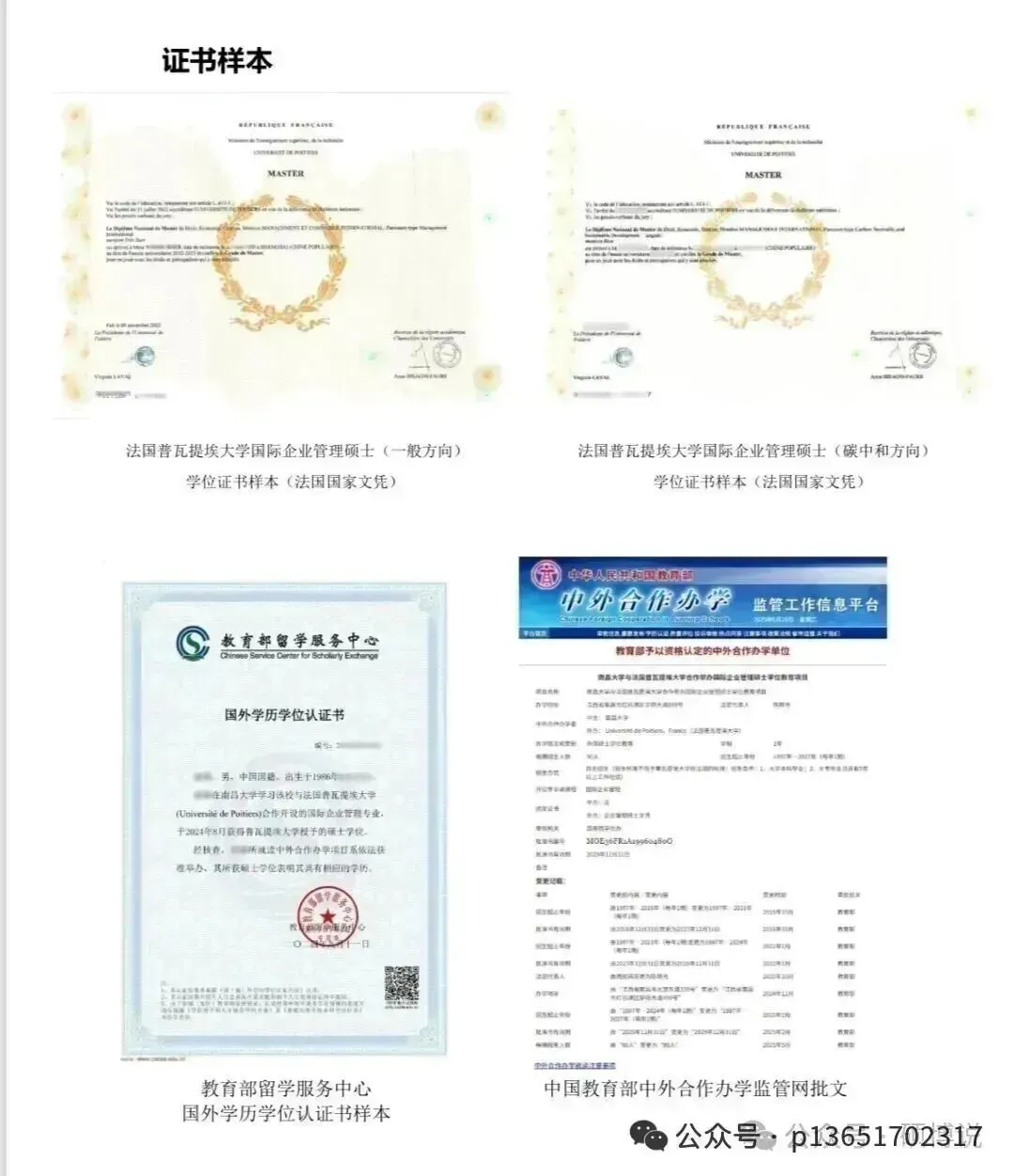 【证书】:法国普瓦提埃大学国际企业管理硕士证书+中国教育部留学服务中心学历学位认证书