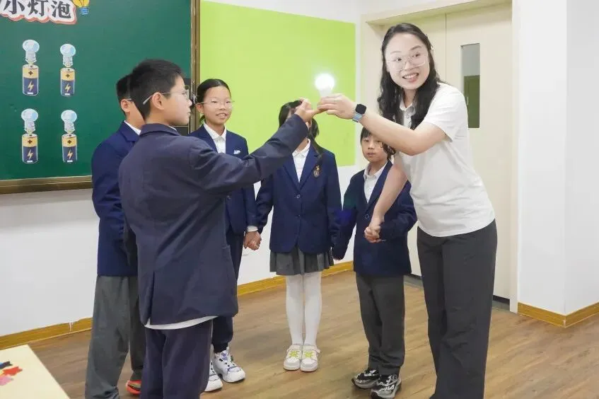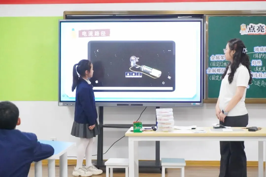 第二节课由胡世莹老师与四(2)班学生共同呈现《点亮小灯泡》。胡老师以“人体导电”魔术开场,瞬间点燃了学生的好奇心。