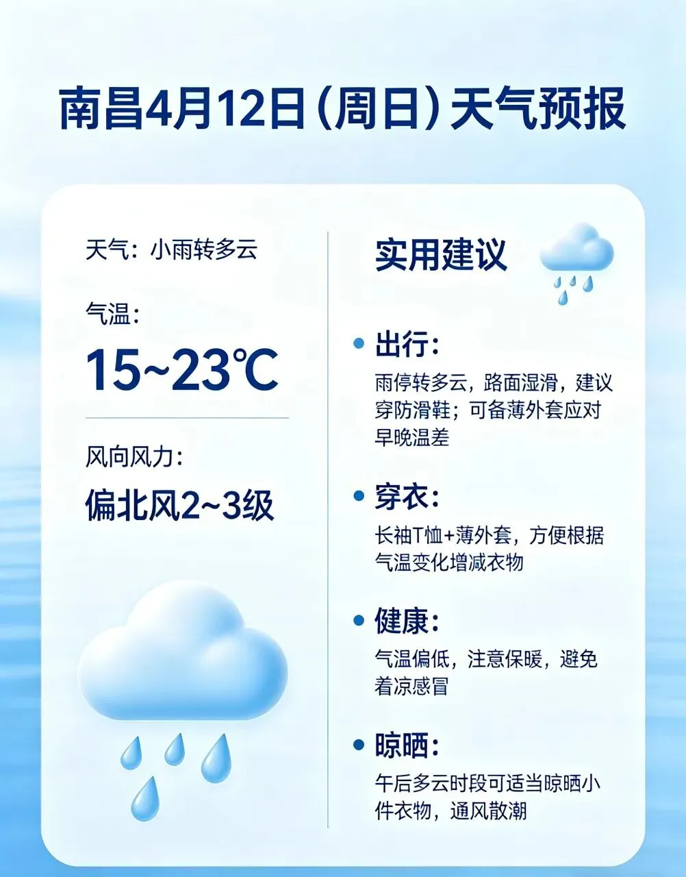 1. 出行:雨停转多云,路面湿滑,建议穿防滑鞋;可备薄外套应对早晚温差。