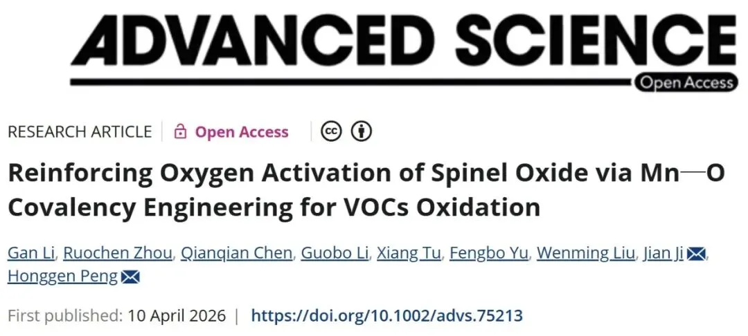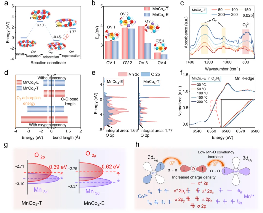 图4 氧活化机理探究图4从理论和实验两方面揭示了弱化Mn-O共价性增强氧活化的本质。DFT计算(图4a)表明,MnCo₄-E中氧空位形成能(3.10 eV)在O₂吸附后降至2.22 eV,说明其具备快速再生氧空位的能力。Co配位高的位点(OV₄)空位形成能最低(图4b),解释了高Co含量利于低温活性的现象。原位DRIFTS(图4c)在MnCo₄-E上检测到明显的超氧(O₂⁻)和过氧(O₂²⁻)物种信号,而MnCo₄-T仅生成少量O₂⁻,证实其更强的O₂活化能力。DFT进一步显示(图4d),MnCo₄-E上O₂吸附后O-O键显著伸长(1.23→1.49 Å),吸附能高达-3.55 eV。PDOS分析(图4e)表明Mn 3d与O 2p轨道杂化减弱,Mn-O共价性降低,有利于电子向O₂的π*轨道转移。原位XANES(图4f)中Mn边随温度升高向高能移动,证实了晶格氧的消耗与再补。图4h总结了电子从Mn经O向O₂传递、生成活性氧物种并参与氧化还原循环的完整机理。