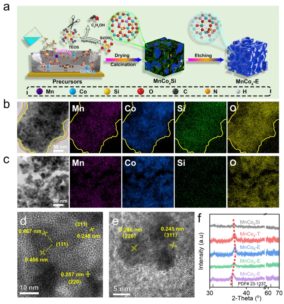 图1 催化剂合成与结构表征图1展示了通过原位硬模板法合成MnCo₄-E的全过程。碱蚀刻去除大部分硅后,MnCo₄-E形成了开放的多孔结构(图S1),TEM元素面分布(图1b-c)显示Mn、Co均匀分散,未发生相偏析。HRTEM(图1d-e)测得(311)晶面间距从0.242 nm增至0.245 nm,XRD(图1f)中衍射峰左移,共同证实了硅掺入引起的晶格膨胀。N₂吸附-脱附(图S4)表明,碱蚀刻后比表面积从68.6提升至81.8 m²·g⁻¹,为反应物提供了更丰富的可及活性位点。