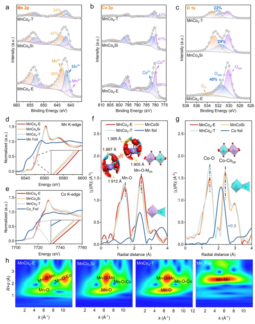 图2 催化剂的电子结构与配位环境XPS分析(图2a-c)显示,MnCo₄-E表面Mn⁴⁺/Co³⁺比例最高,吸附氧占比(0.40)远高于MnCo₄-T(0.22),且Mn 2p结合能正移、O 1s负移,表明电子从Mn向O转移,Mn-O共价性被削弱。XANES(图2d-e)证实Mn和Co平均氧化态升高。EXAFS(图2f-g)中Mn-O键长从1.91 Å伸长至1.93 Å,结合DFT计算的电荷密度差(图S16),从原子尺度确认了硅掺入导致Mn-O键弱化。Raman光谱(图S17)中Mn-O振动峰红移、力常数降低,进一步佐证。小波变换(图2h)清晰分离了Mn-O、Mn-O-Mn和Mn-O-Co散射信号,验证了Mn与Co的原子级混合。