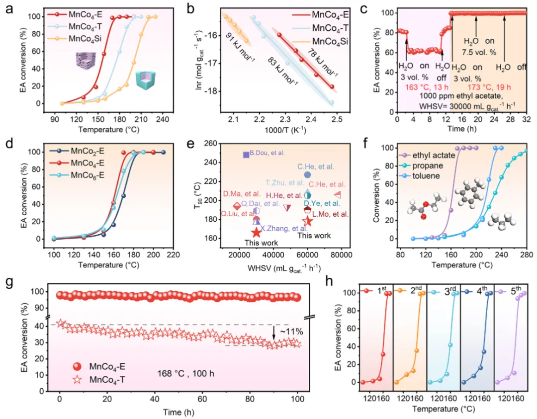 图3 催化性能评估图3证实了MnCo₄-E优异的催化性能。在EA氧化中,其T₉₀低至168°C,而对比样MnCo₄-T在170°C时转化率不足40%(图3a)。表观活化能仅78 kJ·mol⁻¹(图3b),低于MnCo₄-T(83)和MnCo₄Si(91),本征活性显著提升。即使在7.5%水蒸气、173°C条件下,活性仍保持稳定(图3c),展现出卓越的抗水干扰能力。通过调节Mn/Co比发现1:4为最佳(图3d)。与已报道的多种贵金属及过渡金属催化剂相比,MnCo₄-E活性处于领先水平(图3e)。此外,其对甲苯(T₉₀=226°C)和丙烷(T₉₀=260°C)同样高效(图3f),并在100小时连续运行及多次循环中性能几乎无衰减(图3g-h),实际应用潜力巨大。