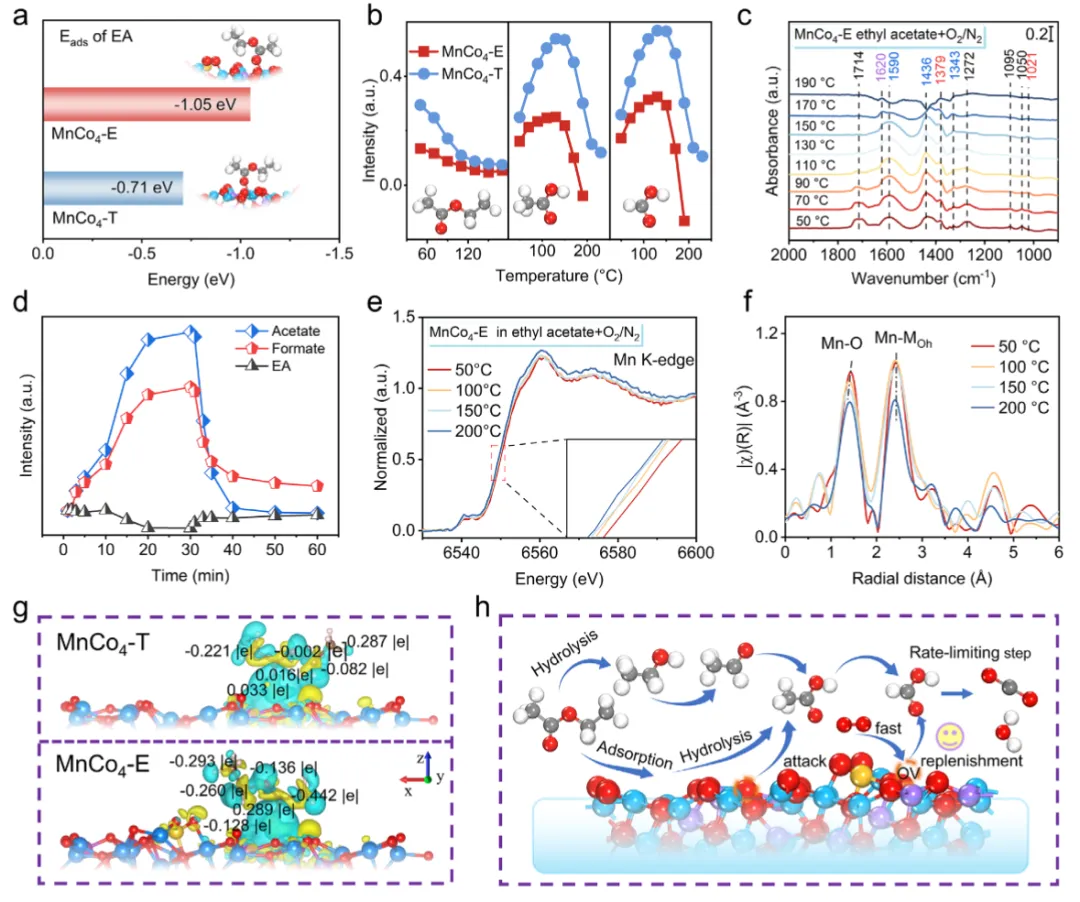图5 乙酸乙酯氧化反应路径图5阐明了EA在MnCo₄-E上的降解路径与决速步。原位DRIFTS(图5b-c)显示,EA在室温下迅速水解为乙酸盐和甲酸盐,并在130°C以上开始被消耗。与MnCo₄-T相比,MnCo₄-E上乙酸盐/甲酸盐的转化温度更低(140°C vs 170°C),证明弱化Mn-O共价性有效降低了决速步(羧酸盐氧化)的能垒。气氛切换实验(图5d)表明,无氧条件下乙酸盐积累并生成乙烯副产物,通入O₂后迅速完全氧化,证实了反应遵循Mars-van Krevelen(MVK)机理。原位XAFS(图5e-f)显示,反应中Mn氧化态降低、Mn-O配位数下降,直接证明了晶格氧的参与。电荷密度差(图5g)表明,MnCo₄-E向EA转移更多电子,使其α-碳更具电负性,易受晶格氧攻击。图5h总结了EA先水解为乙酸盐、再经甲酸盐路径最终矿化为CO₂和H₂O的完整反应路径。