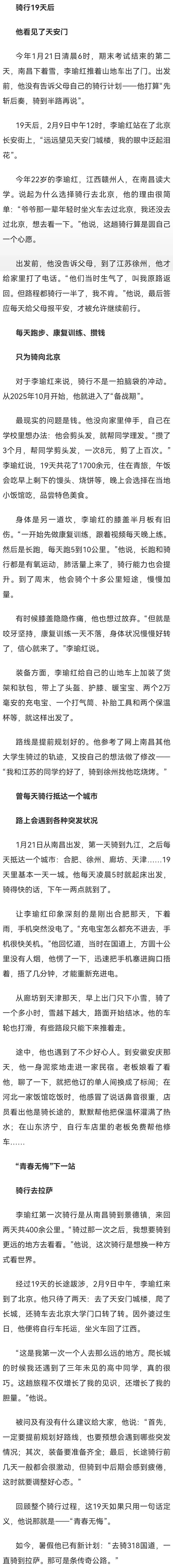 从南昌到北京,19天,1617公里,一辆二手山地车,花费1700余元。22岁的江西大二学生李瑜红在今年寒假完成了他期待许久的骑行。对于此行,他用“青春无悔”来定义,并给自己制定了下一站计划——暑假骑行去拉萨。