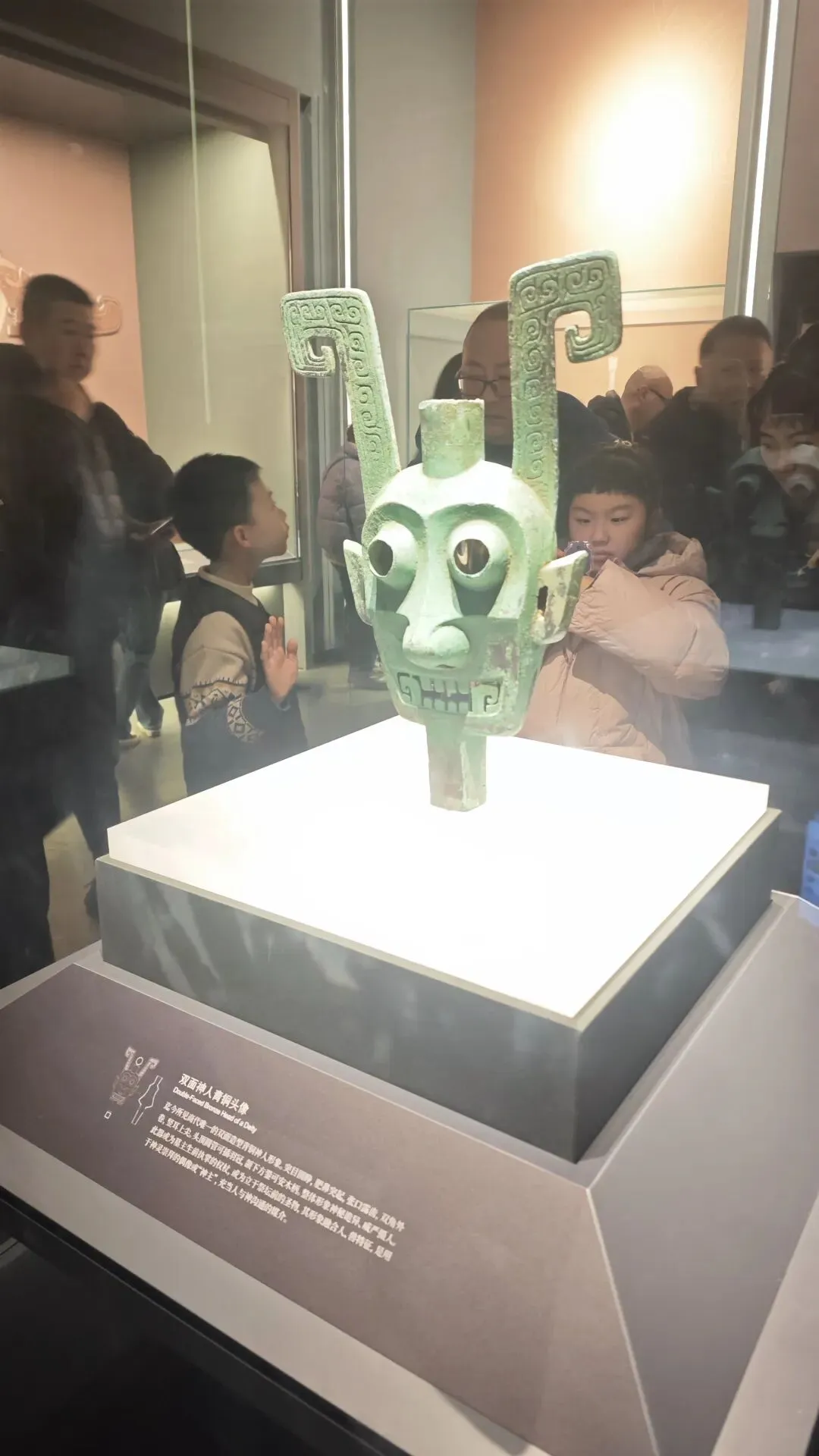 此行第一站,我们走进了江西省博物馆。馆内琳琅满目的文物,瞬间抓住了小朋友的目光,古朴厚重的青铜器、精致典雅的陶瓷器,每一件都诉说着千年岁月的故事。而最让小朋友念念不忘的,便是双面神人青铜头像。这件来自商代的国宝,是江西省博物馆的镇馆之宝之一,它有着两张对称的人脸,圆眼凸显,头顶生角,造型神秘又独特。据悉,这件独一无二的青铜珍品,是古人用来沟通天地、祭祀祈福的礼器,静静伫立在它面前,仿佛能触摸到三千年前的文明脉络。