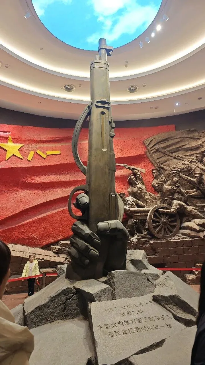 第二站,我们来到八一纪念馆。恰逢春节,这座红色教育基地迎来了众多游客,我们足足排了半个多小时的队,才如愿进入馆内。踏入老馆,一幕幕场景仿佛穿越时空,将我们拉回那个风雨飘摇的年代,耳畔似乎回响着激昂的枪炮声,更能深刻体会到当年革命先辈们奋起抗争、牢牢把握命运的坚定与果敢。走进新馆,小朋友特意站在军旗与标志性步枪雕塑前合影,或许他此刻还不能完全理解八一起义的历史深意,不懂军旗承载的信仰与荣光,但他努力学着做出标准的敬礼动作,认真端详一张张泛黄的老照片、一件件斑驳的旧武器,仔细看着一个个鲜活的历史复原场景,仿佛在聆听着革命先辈们浴血奋战的英雄故事,红色的种子,已然悄悄在心底埋下。