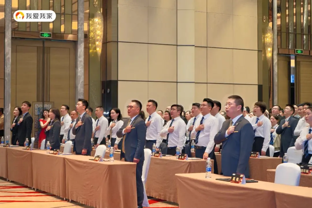 紧接着全场起立,齐唱司歌《用爱铸家赢天下》。熟悉的旋律,温情的歌词,唱出了爱家人的团结与激情。