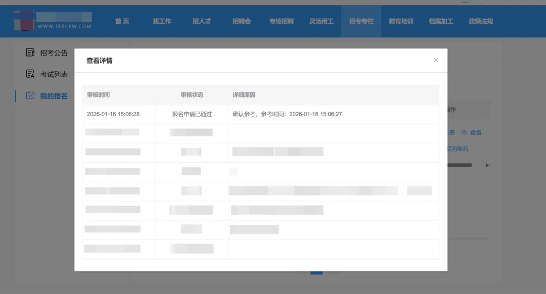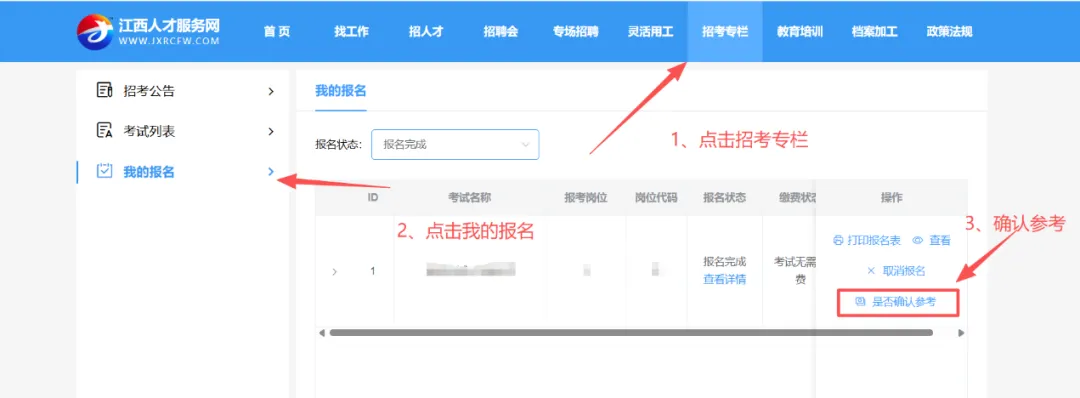 具体方式为:登录报名网站后,由“招考专栏”-“我的报名”选择报名专题,在右侧“操作”项内选择“是否确认参考”,仔细阅读弹窗文字并点击“确认”后完成。确认参考人员可于“报名状态”中点击“查看详情”确认。未在限期内或未按要求进行的,视为放弃。操作可参见下图或“报名指南”:https://www.jxrcfw.com/exam/help/7