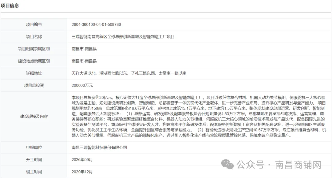 4 月 10 日,南昌三瑞智能科技股份有限公司(股票简称:三瑞智能,股票代码:301696.SZ)正式登陆深交所创业板,成功敲钟上市,一举拿下全国无人机动力系统第一股的重磅头衔,为南昌本土上市企业军团再添硬核一员!作为土生土长的南昌企业,三瑞智能总部坐落于南昌高新区,自 2009年成立以来便深耕民用无人机及机器人电动动力系统领域,凭借过硬的技术实力站稳全球赛道。按 2024 年销售额计算,其民用无人机电动动力系统(不含动力电池)全球市场份额达 7.1%,位列全球第二,产品远销全球100 多个国家和地区,是海内外多家知名无人机企业的核心供应商,用硬核智造擦亮了南昌科创名片。就在此次上市前夕,三瑞智能总投资 20 亿元的全球总部创新基地及智能制造工厂项目已顺利完成备案。该项目落户南昌高新区,选址天祥大道以北、瑶湖西七路以东、子礼三路以西、太常南一路以南,计划 2026 年 9 月开工,2029 年 12 月竣工,建成后将进一步强化研发创新与智能制造能力。关于该项目的完整详情,可查看此前报道:重磅!南昌再添 20 亿级高端智造产业大项目!国际前三、国内第一!一边登陆资本市场获得强劲资本赋能,一边落地重大产业项目夯实长远根基,三瑞智能的双重突破,不仅是企业自身发展的关键跨越,更为南昌高端装备制造、无人机产业集群发展注入了强劲动能。三瑞智能的上市,既是企业自身实力的彰显,更是南昌智造强势崛起的生动缩影。未来,随着 20 亿元全球总部创新基地的稳步推进,叠加上市后的资本优势,这家南昌本土硬核企业必将持续领跑全球无人机动力赛道,也让更多人看见实力不凡、活力满满的硬核南昌!