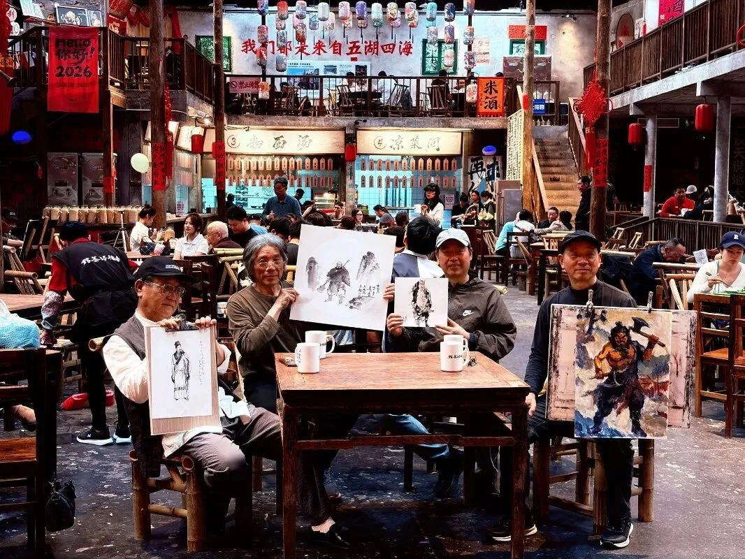 4月13日—4月19日:周日上午10:00 · 「画家画水浒」现场直击📸 特邀画家现场手绘,以笔墨丹青再现水浒英雄风采。老画师挥毫泼墨,水墨丹青里,水浒英雄活了过来,每一笔都藏着江湖豪情,每一幅都有不一样的水浒故事,围坐在茶馆里,品着茶,看大师作画,听水浒趣闻,一秒穿越回水泊梁山,沉浸式感受侠义江湖。