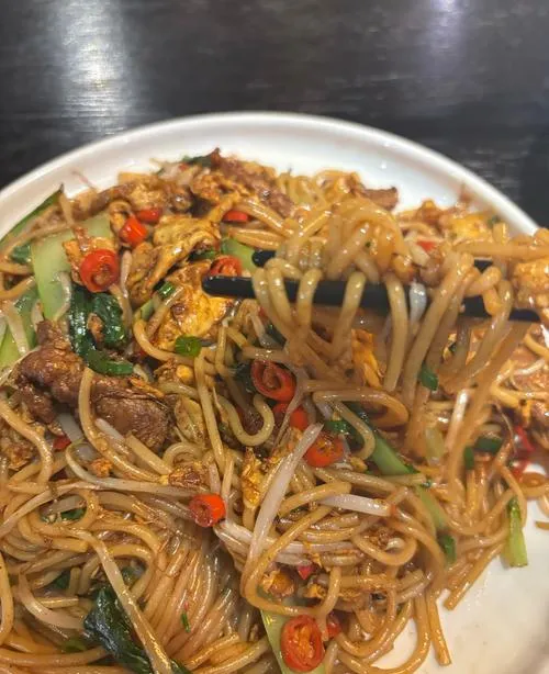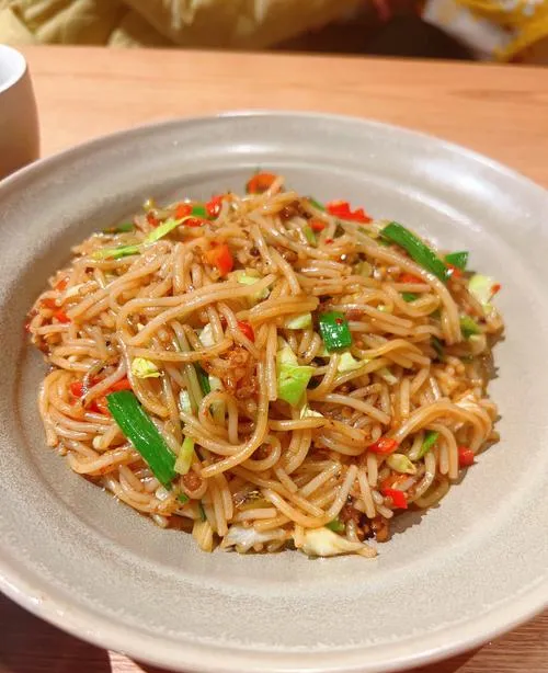 这道炒粉最经典的搭配,猪肉末在中医里能滋阴润燥、补虚强身,而米粉经过爆炒后吸收了油脂和香料的香气,变得筋道爽滑。吃上一口,先是辣椒和姜蒜的辛香冲开鼻窍,接着米粉的嚼劲在齿间弹跳,最后留在舌尖的是咸香微辣的余味。特别适合当作早餐或加班后的夜宵,吃下去没多久就能感觉肚子里暖烘烘的,原本发凉的双手也开始回温。