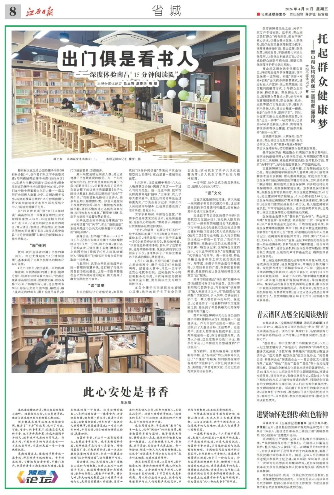 一座城市的内涵,不只有楼宇的高度,更有人文的温度;一座城市的发展,不单是速度的追逐,亦是气质的沉淀。南昌的书香建设,正是这份温度与沉淀的恰到好处。当阅读空间成为城市的公共客厅,当书香融入市井烟火,这座城市的营商环境里,便多了一份软实力。外来客商走进雅致的书房,读懂的不仅是南昌的文化品位,更是这座城市的包容,便愿意在此扎根,共赴美好;当年轻人在便捷的阅读空间里寻得精神的涵养,也许会爱上这座腹有诗书气自华的城市,让南昌成为“此心安处是吾乡”的所在。