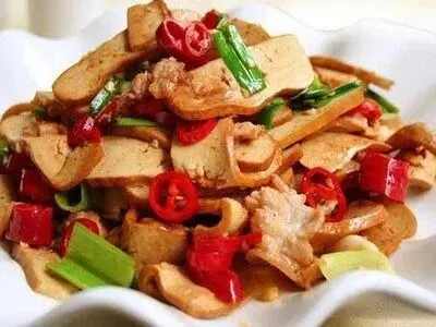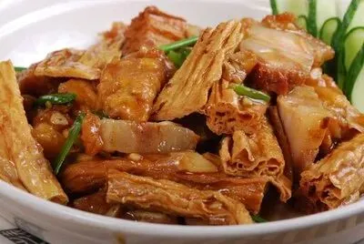 腐竹烧肉、辣椒炒蛋、蒜蓉粉丝娃娃菜、绿豆汤、纯牛奶