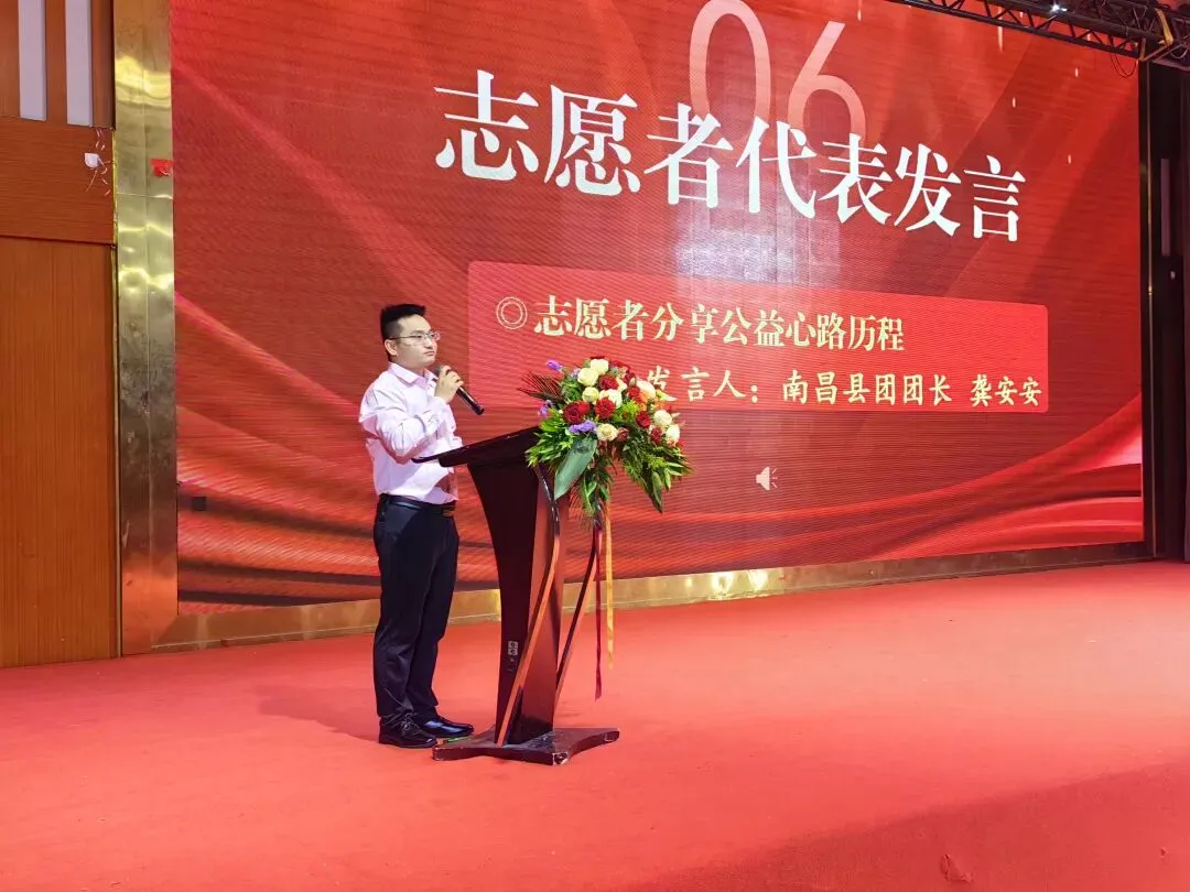 南昌县团团长龚安安上台分享:“我们做志愿者,不是为了光环,只是想成为一束微光,照亮孩子前行的路。”