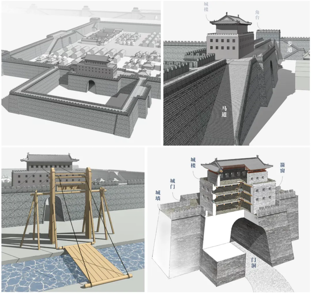 城门是标配,城楼/箭楼、瓮城、壕沟/护城河都是可扩展选项