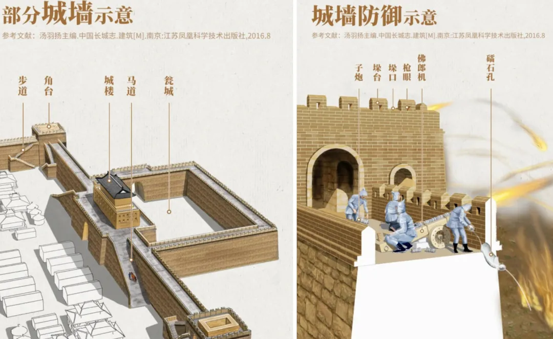 明朝开始大规模使用砖石砌筑城墙,包砖的城墙使墙体更加坚固耐久。在城墙之上修建有枪眼、垛口、垛台、礌石孔等作战装置。为了增加城墙的防守强度甚至在城墙上装配一种起源于葡萄牙的威力巨大的火炮“佛郎机”。