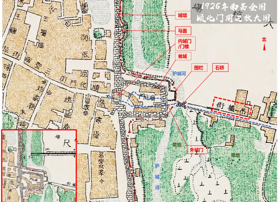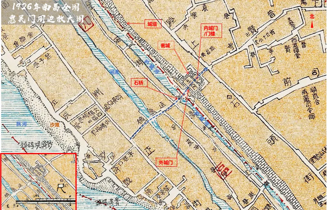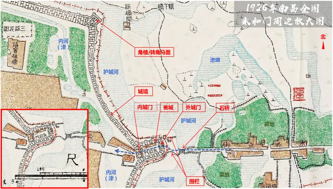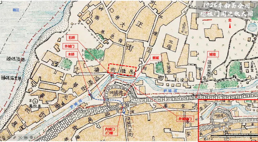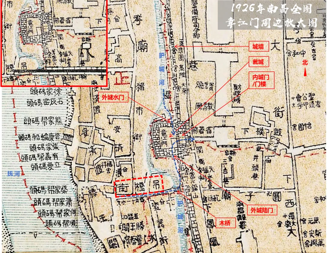 6、章江门瓮城平面呈现矩形(东西宽约50米,南北长约50米),面积≈2500平米。章江门即是现在的章江路和榕门路交叉口,地图上显示往东边直对当时的滕王阁(现在的新址是往北移到了赣江边,1926年滕王阁也毁于战火之中),从吊桥街往西过一木桥到章江门的南侧陆门(猜测)进入瓮城。历史记载章江门明代改造后是水路两用门。从地图中吊桥街一段通向护城河的断头路,斜对瓮城,推断此处以前有吊桥通向陆门。而瓮城北侧护城河有一小豁口,则猜测是水门码头的遗存。门内是晚晴的布政司、巡抚、南昌县署等“行政中心”所在地,民国时期布政司改为省长公署、警备司令部。