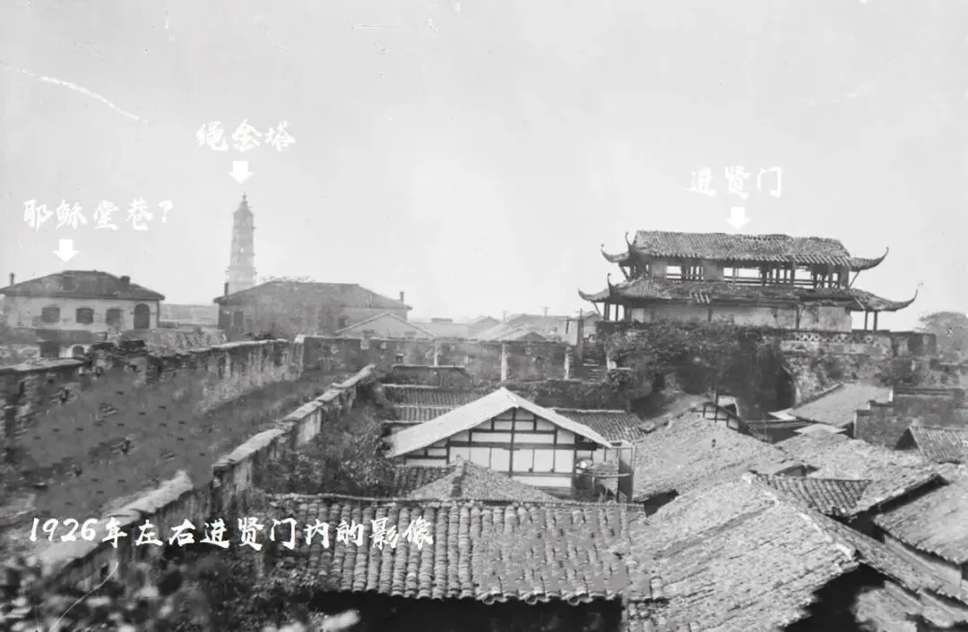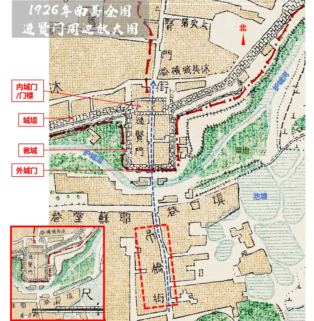 3、进贤门瓮城平面呈现矩形(东西宽约60米,南北长约75米),面积≈4500平米。从进贤门外吊桥街过护城河,可直接进入外城门内的瓮城,瓮城内房屋拥挤,直通进贤门楼的城内(今天的系马桩街),不远处是当时豫章书院所在地。由于抚河沿岸是当时南昌古城重要的交通集散地,靠城市形成了进贤仓、南昌仓等一众商贸物流区和码头底层劳工聚居(棚户)区。聚居房屋多为竹篾黄泥棚,遇雨易塌。劳工聚集区边的耶苏堂巷是天主教最早传入南昌的地点,1595年(明万历时期)利玛窦在此购屋设立临时教堂 “圣堂”,后逐步扩大。值得疑虑的是1905年地图上,进贤门城墙围合出了2个瓮城,还值得继续研讨,但从瓮城占地规模和它主楼三重檐的形制上也足可见其等级很高。