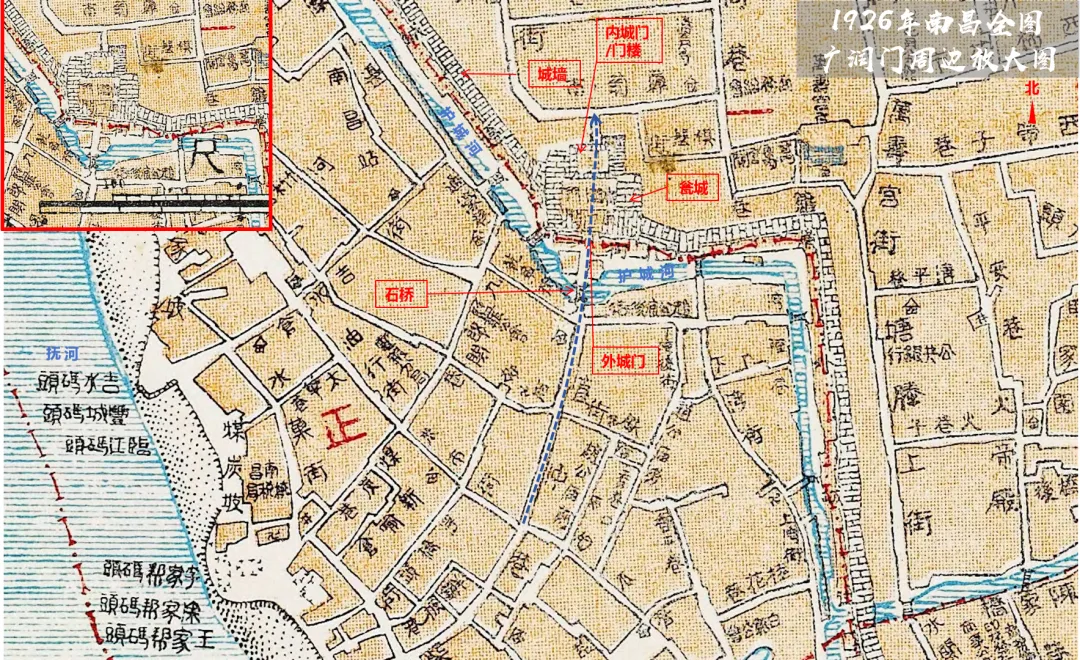 5、广润门瓮城平面呈现矩形(东西宽约50米,南北长约40米),面积≈2000平米。从抚河边“煤炭巷”直通广润门,广润门的城门楼也在内城门之上。抚河边码头林立,显示当时南昌城西侧靠抚河是最繁忙之地。广润门外有吉水仓,城门南侧的护城河边还有一些空地,像是“水路遗存”。广润门内侧即是现在的旅游景点万寿宫历史街区。当时南昌古城的孔庙、洪都书院、友教书院、南昌府学都在城内的万寿宫这一带。