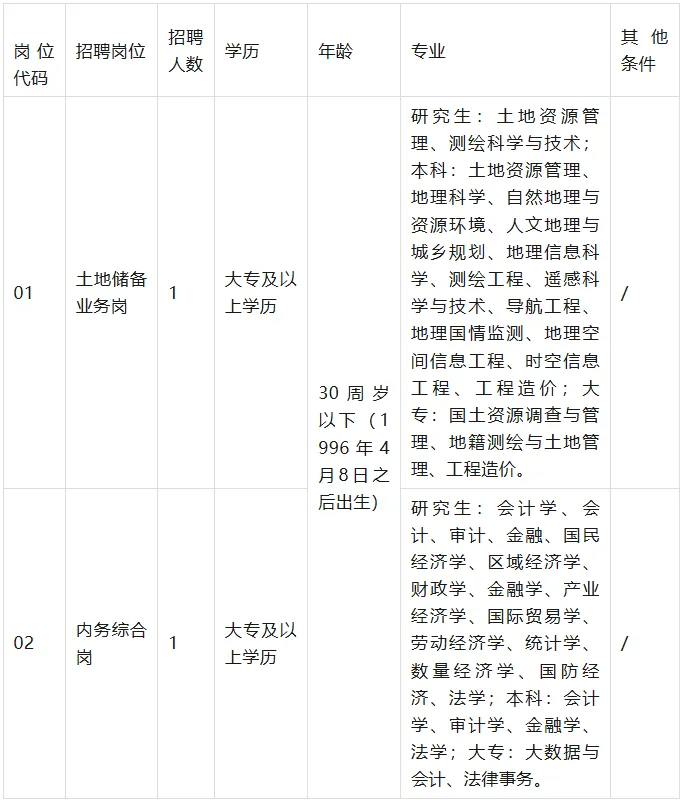 二、报考条件(一)基本条件1、具有中华人民共和国国籍;2、拥护党的路线、方针、政策,遵守国家法律法规;3、工作责任心强、吃苦耐劳、事业心强,能保守工作秘密,服从组织安排,热爱土地储备工作;4、品德端正,身体健康;5、法律、法规、政策规定的其他条件;6、具备招聘岗位要求的其他条件;7、年龄、学历、学位等取得时间的计算截止日期为2026年4月8日。(二)以下人员不具备报考条件1、处于党纪处分、政纪处分、组织处理所规定的影响期内的;2、曾因犯罪受过刑事处罚的人员和曾被开除公职的人员、受到党纪政纪处分期限未满或者正在接受司法调查尚未做出结论的人员;3、有恶意失信行为被法院纳入失信被执行人名单且至今未撤销的;4、曾在公务员招录、事业单位公开招聘考试中被认定有舞弊等严重违反招聘纪律行为的人员;5、因严重违反工作纪律被原工作单位解聘、辞退的;6、违反社会公德、职业道德,造成不良影响的;7、其他原因不适宜报考的人员。三、招聘程序本次公开招聘实行统一报名、统一考试、统一聘用的方式,按照网上报名、资格审查、笔试、面试、体检、聘用的程序进行。(一)信息发布本次公开招聘信息在君晟才智招聘网http://www.jsczzp.com、君晟才智公众号等平台公开发布。(二)报名1、报名时间:本公告发布之日起至2026年4月10日24:00,逾期不再受理报名。2、报名方式:本次招聘采取网络报名方式,报考人员通过电脑登录君晟才智招聘网(http://www.jsczzp.com),进入“2026年面向社会公开招聘劳务派遣制工作人员公告”栏目,通过“报名入口”索引进行报名。据实填写报名信息、上传《2026年面向社会公开招聘劳务派遣制工作人员报名登记表》(详见附件一)、有效的身份证、毕业证及二寸彩色电子照片(JPG格式)。每人限报一个岗位。3、报名费:50元/人。报名人员完成报名后,在2026年4月10日24:00前登录报名系统完成缴费,逾期不再受理缴费。未完成网上缴费的,报名无效。弃考者报名费不予退回。4、本次报考实行诚信报名,网上报名时不进行资格审查,请考生仔细阅读招聘公告,不符合报名条件的人员请勿报考,由此产生的一切后果由考生本人负责,报名费不予退回。5、开考比例:本次招聘人数与报考人数比例原则上不低于1:3,比例不足时,可根据用人单位研究决定后,适当延长报名时间或降低比例,以公告为准。6、特别提醒:本次招聘的后续事项均在君晟才智招聘网(http://www.jsczzp.com)发布相关信息,请报名考生密切关注君晟才智招聘网,不再另行通知。(三)资格审查资格审查采取现场确认的方式进行,本次招聘实行诚信报名制度,报名人员填报的信息及所提交的报名材料必须真实、准确、完整、有效,且符合本次报考的全部条件,资格审查贯穿招聘工作的全过程,一经发现不符合相关条件者,取消报名、考试、聘用等资格,后果由报名人员自行承担。1、资格审查时间:2026年4月14日14:00-17:00,逾期不参加资格审查的,视为自动放弃报考资格。2、资格审查地点:江西省南昌市经开区双港西大街528号中国南昌人力资源服务产业园8号楼11层。3、资格审查所需材料:(1)《2026年面向社会公开招聘劳务派遣制工作人员报名登记表》1份(本人手写签名),照片处请黏贴照片或彩色打印;详见附件一;(2)本人户口簿户主及本人页复印件1份,原件现场核对;(3)本人身份证复印件1份(正反面复印在1张A4纸上),原件现场核对;(4)有效学历、学位证书复印件各1份,原件现场核对;(5)有效期内的《教育部学历证书电子注册备案表》复印件1份;以国(境)外学历报考的,须提供教育部留学服务中心出具的学历认证材料复印件1份,原件现场核对;(6)本人户籍所在乡镇(街道)公安部门出具无违法犯罪记录证明原件1份(江西籍户籍可在贛服通开具,无违法犯罪记录证明申请办理需3个工作日,请考生提前办理,以免影响后续资格审查);(7)本人近期免冠一寸彩照2张(与网上报名上传电子照片同版)。4、经资格审查合格的考生方可进入笔试环节。未在规定时间内到现场进行资格审查的考生视为自动放弃本次考试资格。(四)笔试1、笔试准考证打印时间:2026年4月17日 10:00 —2026年4月18日8:00,各位考生可登录君晟才智招聘网http://www.jsczzp.com“2026年面向社会公开招聘劳务派遣制工作人员公告”栏目打印准考证。2、笔试时间及地点:详见笔试《准考证》。3、笔试科目:笔试采用闭卷的方式进行,笔试科目为公共基础知识和公文写作,考试时长90分钟,满分100分。4、笔试成绩:考生可在考试后的3日内登录君晟才智招聘网http://www.jsczzp.com“2026年面向社会公开招聘劳务派遣制工作人员公告”栏目自行查询笔试成绩。5、入闱面试确认:根据笔试成绩从高到低,按照1:2的比例,确定入闱面试人员,末位成绩并列的一并入闱面试。(五)面试1、面试时间及地点:另行公告,详见面试通知书。2、面试方式:面试采取结构化方式进行,主要考核考生的综合分析、逻辑思维、组织协调、人际交往、语言表达、举止仪表、临场应变和解决实际问题的能力。面试总分为100分。(六)成绩合成1、总成绩:总成绩=笔试成绩×50%+面试成绩×50%笔试成绩、面试成绩、总成绩均保留小数点后2位数,第二位小数按四舍五入法处理。2、成绩排名:根据总成绩从高分到低分进行排名。总成绩相同的,面试成绩高者优先。3、入闱体检人员确认:根据考试总成绩,按