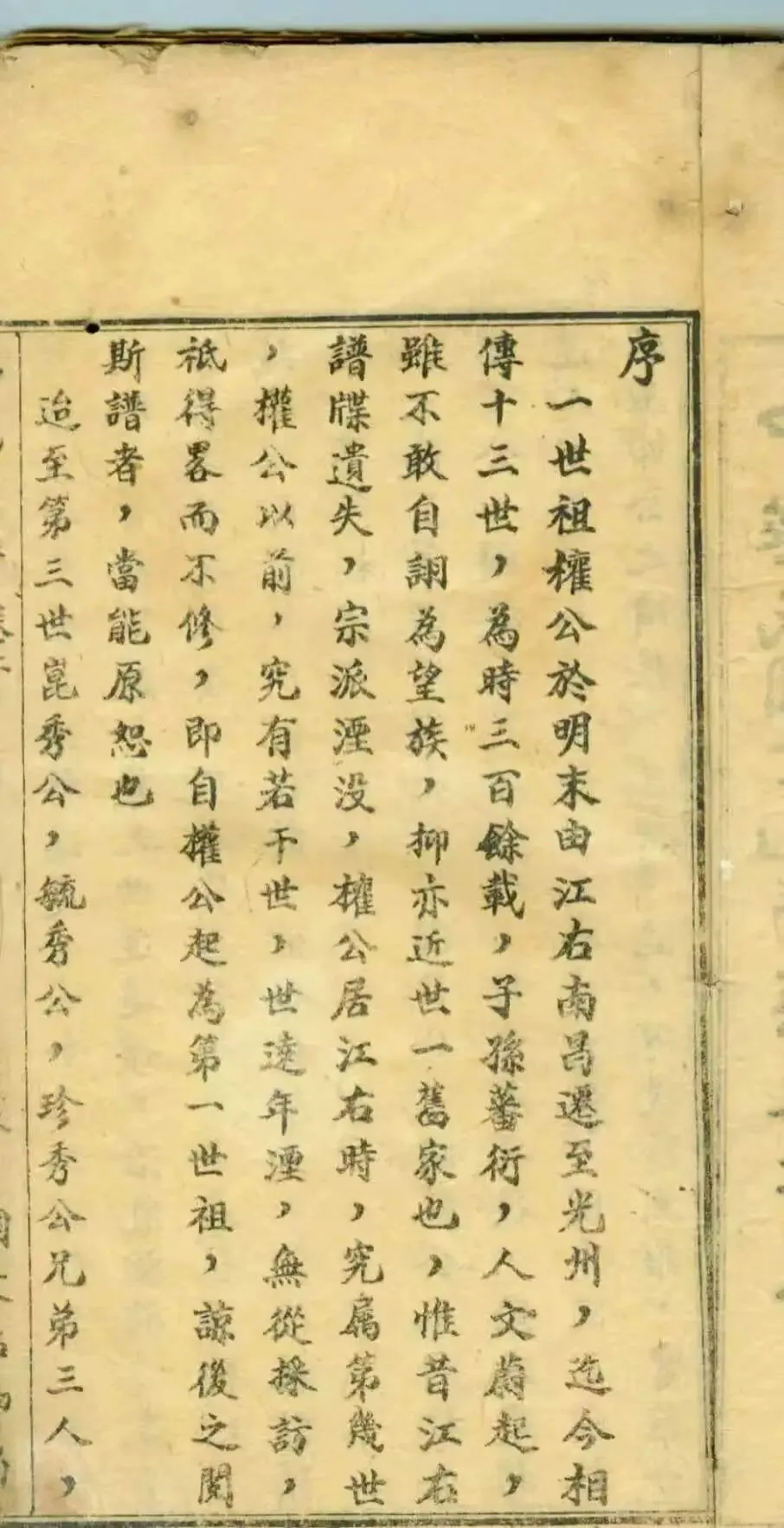 "一世祖權公於明末由江右南昌遷至光州,迄今相傳十三世,為時三百餘載。"