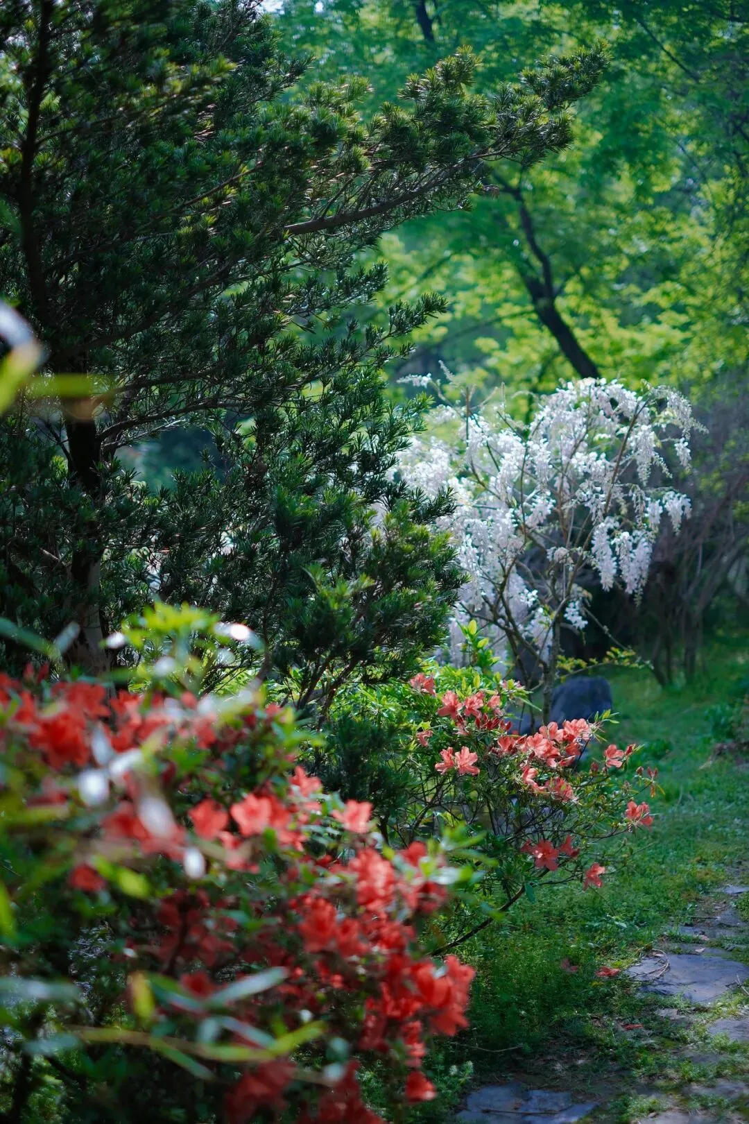四月初,它开得最欢,如果我们没有时间到梅岭塔下村看漫山杜鹃,到这里不失为一种选择。它颜色丰富,品种多样,除了红色,还有白色和紫色。它偏居一偶,但却光彩照人。
