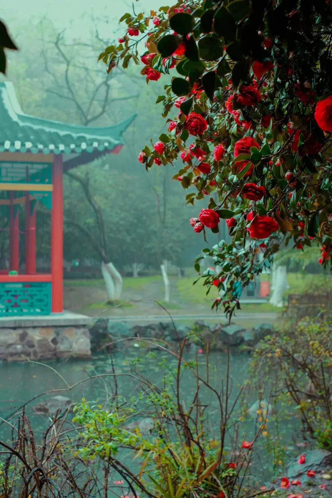 公园里的茶花最常见,特别是园中园的茶花最招人喜欢。雨后的茶花油润,似油画,特别是和亭台楼阁呼应,使园中园更有古典韵味。 我喜欢在雨天的园中园散步,人不多,空气清新,雨声、鸟鸣,很有江南烟雨韵味。