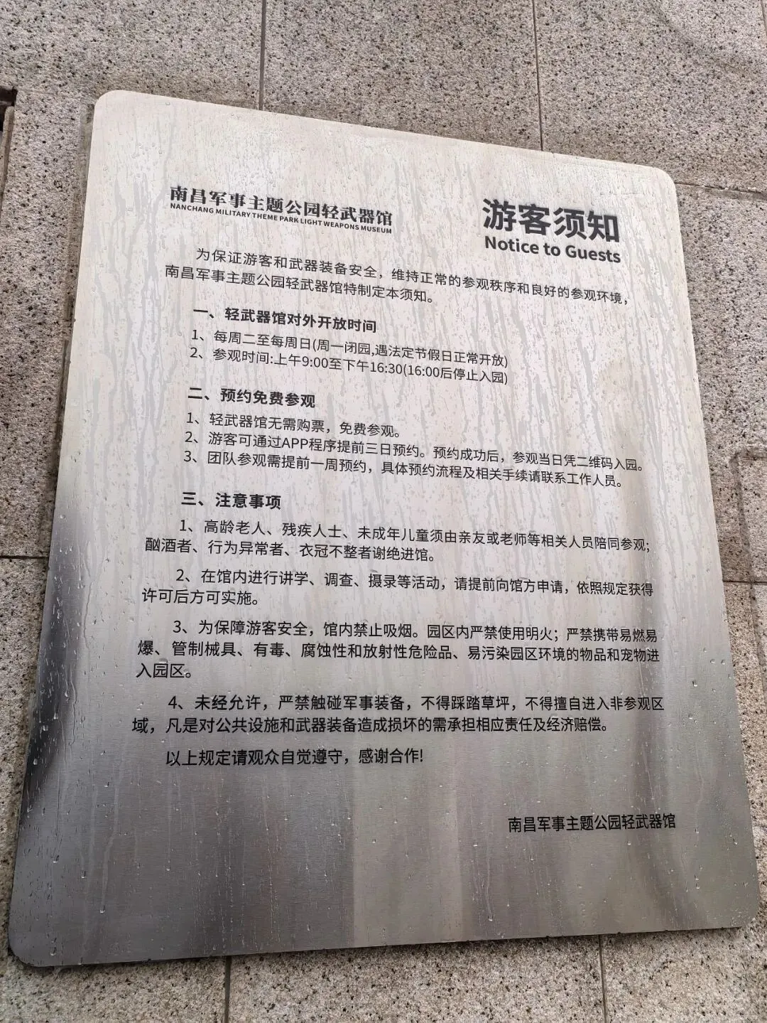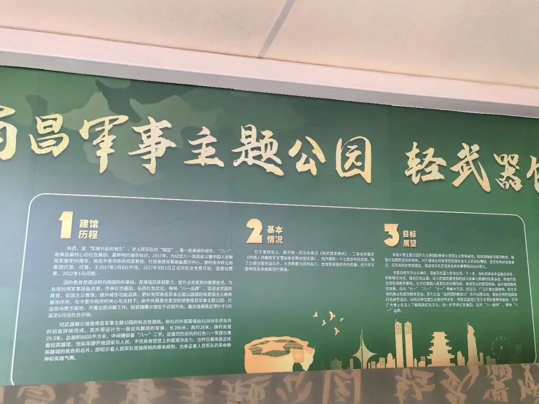南昌是人民军队的摇篮、军旗升起的地方、英雄城。这座城市有英雄的气质,军事主题文化氛围很浓厚。南昌既有八一起义纪念馆等革命旧址,又有南昌舰主题园、建军雕塑广场、南昌军事主题公园等适合家长带小朋友亲子旅行参观的地方。另外,目前南昌还在建设陆军博物馆。之前整理了很多【红色足迹】的资料。今天,来梳理总结一下 【南昌军事主题公园】 的有关资料。一是方便江西文旅从业者参考,二是给有需要的家长朋友、军事迷等提供一个参考资料。南昌军事主题公园免费开放。分两个区域:轻武器展示馆和重武器展示区。两个地方相隔不远,但是是不同的停车点,目前两个园区是没有办法直接互通的。请看清楚定位。