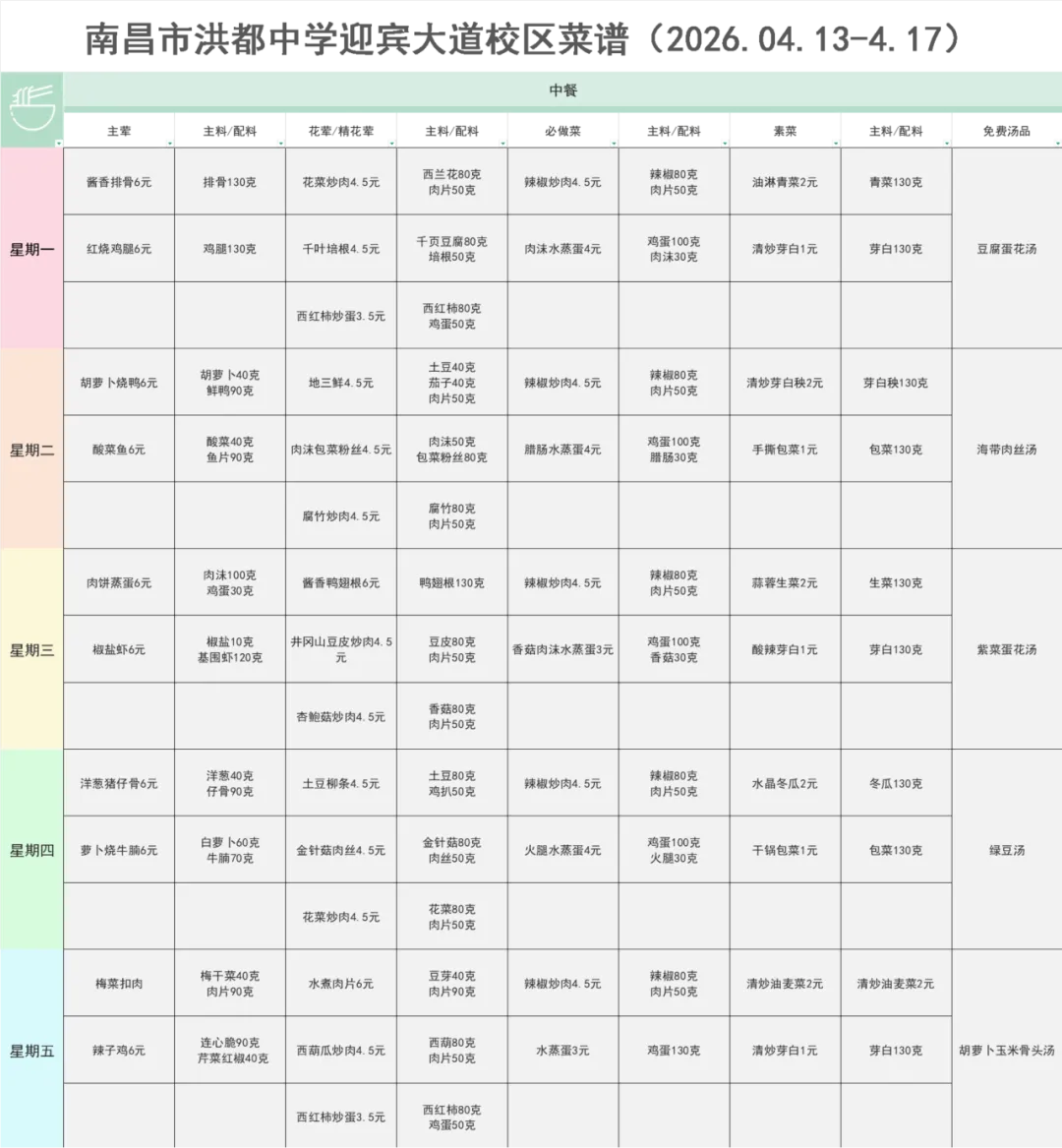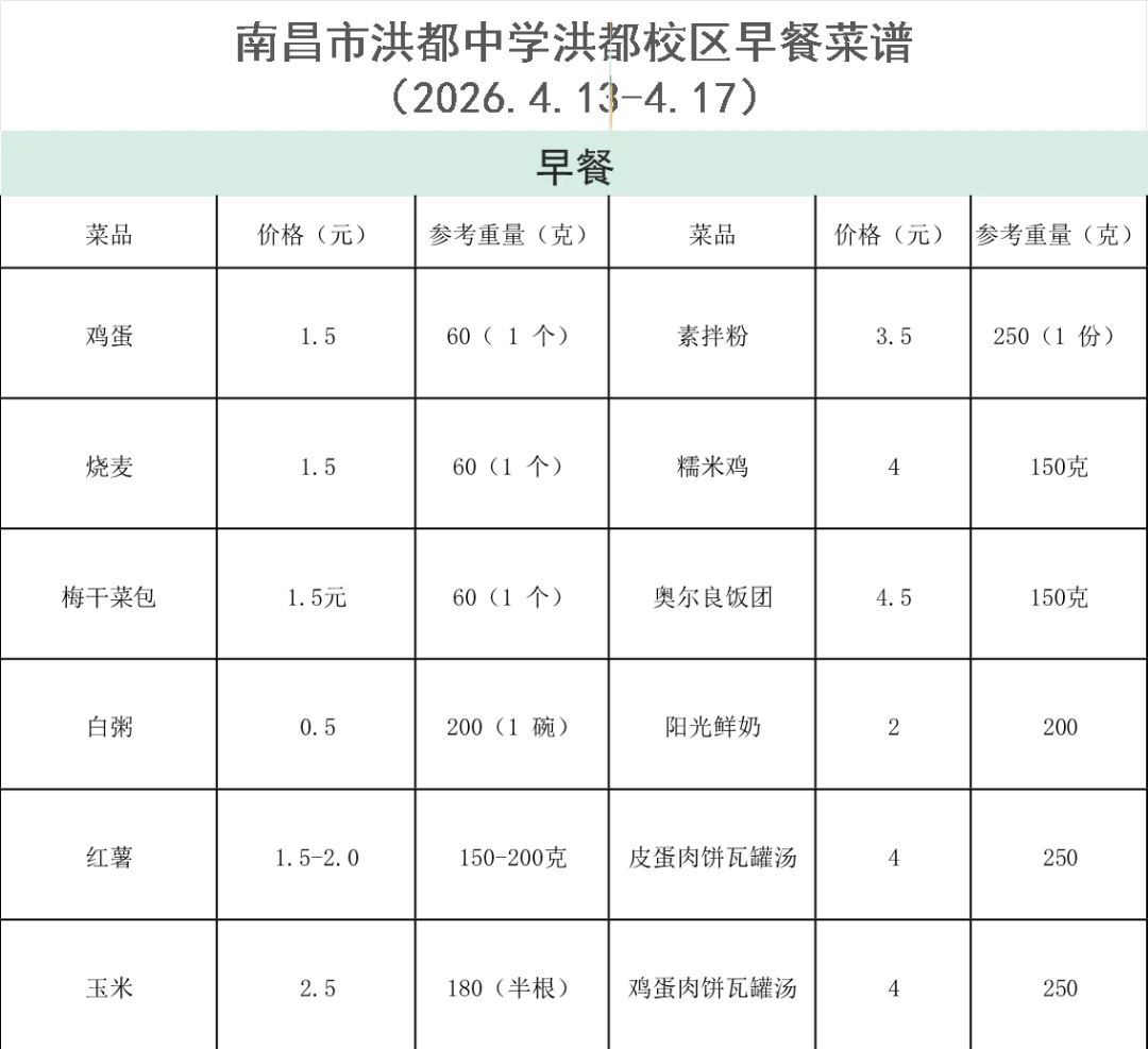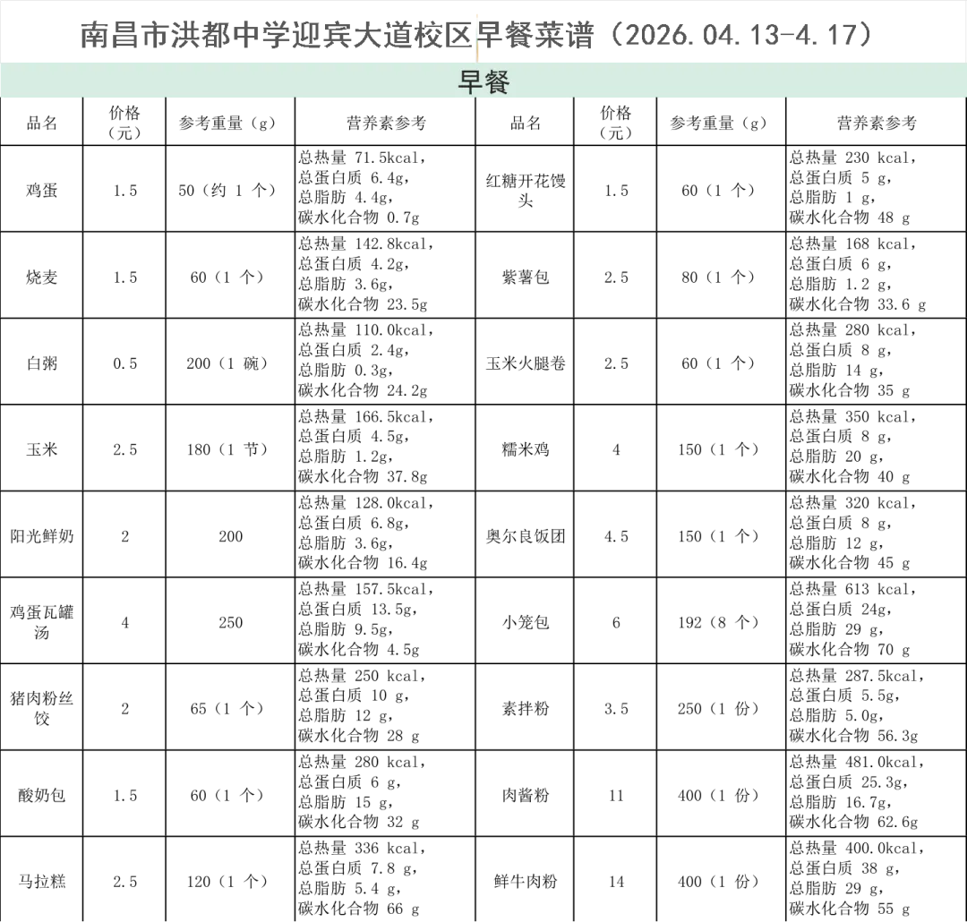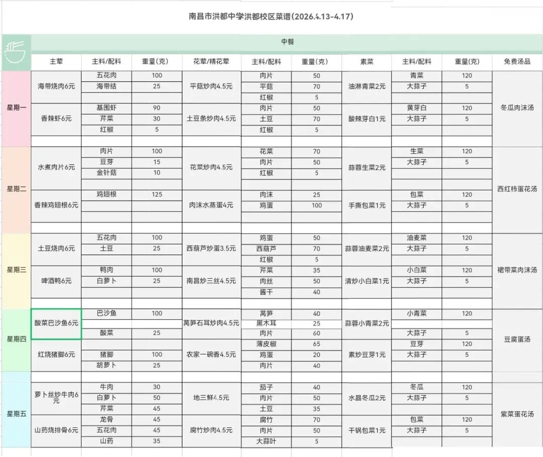 南昌市洪都中学一周菜谱公示(2026.4.13-4.17)