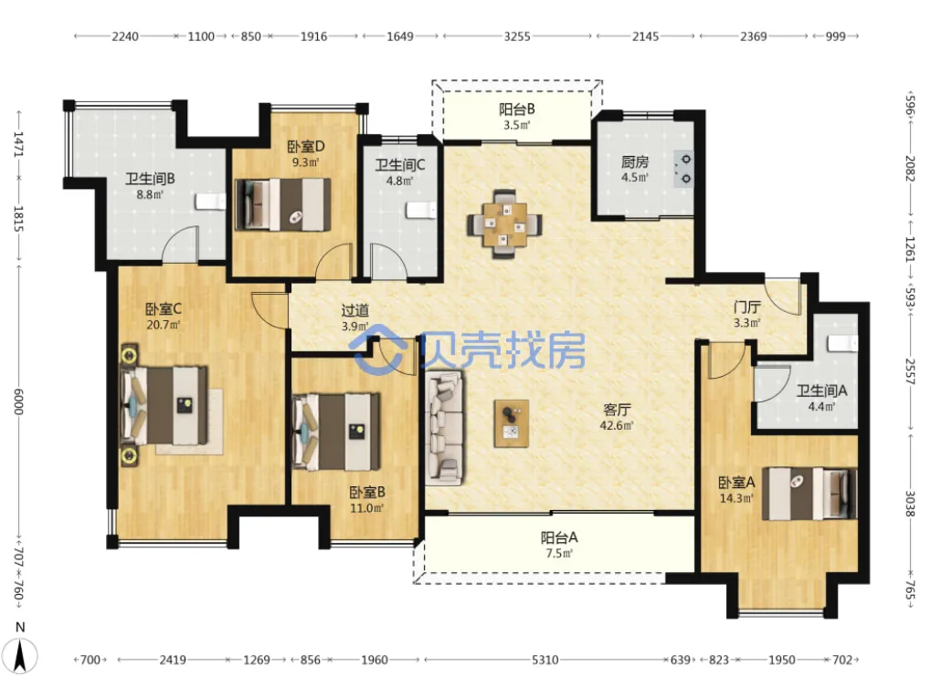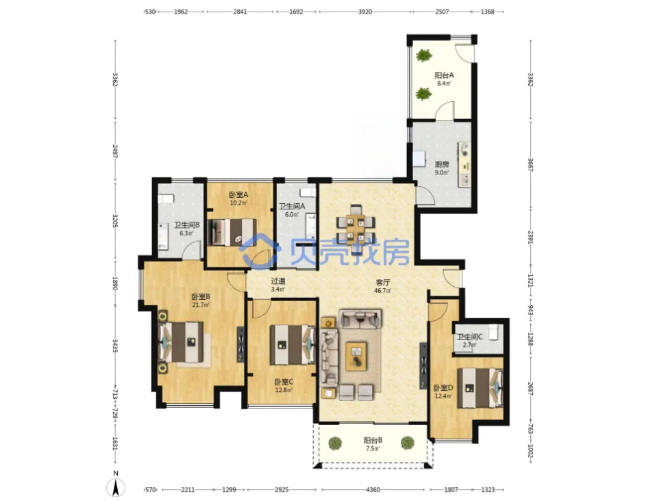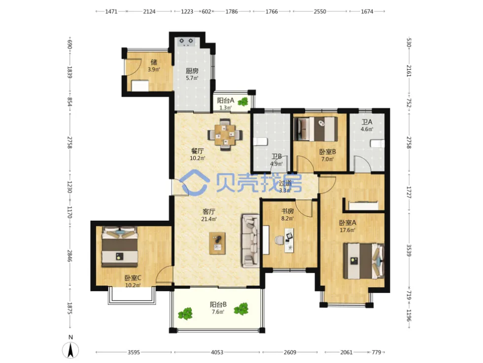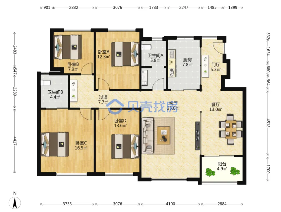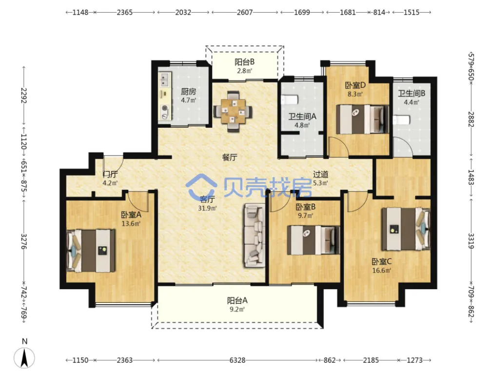 恒大名都,163.84m²,170万,精装四房