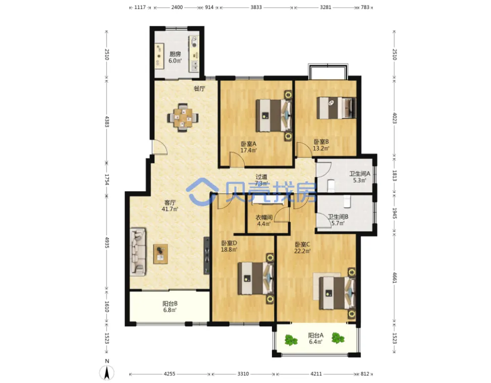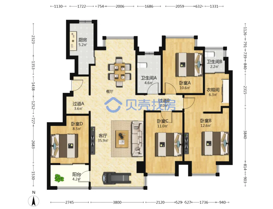 艾溪康桥,141.76m²,172万,大四房,新中式装修